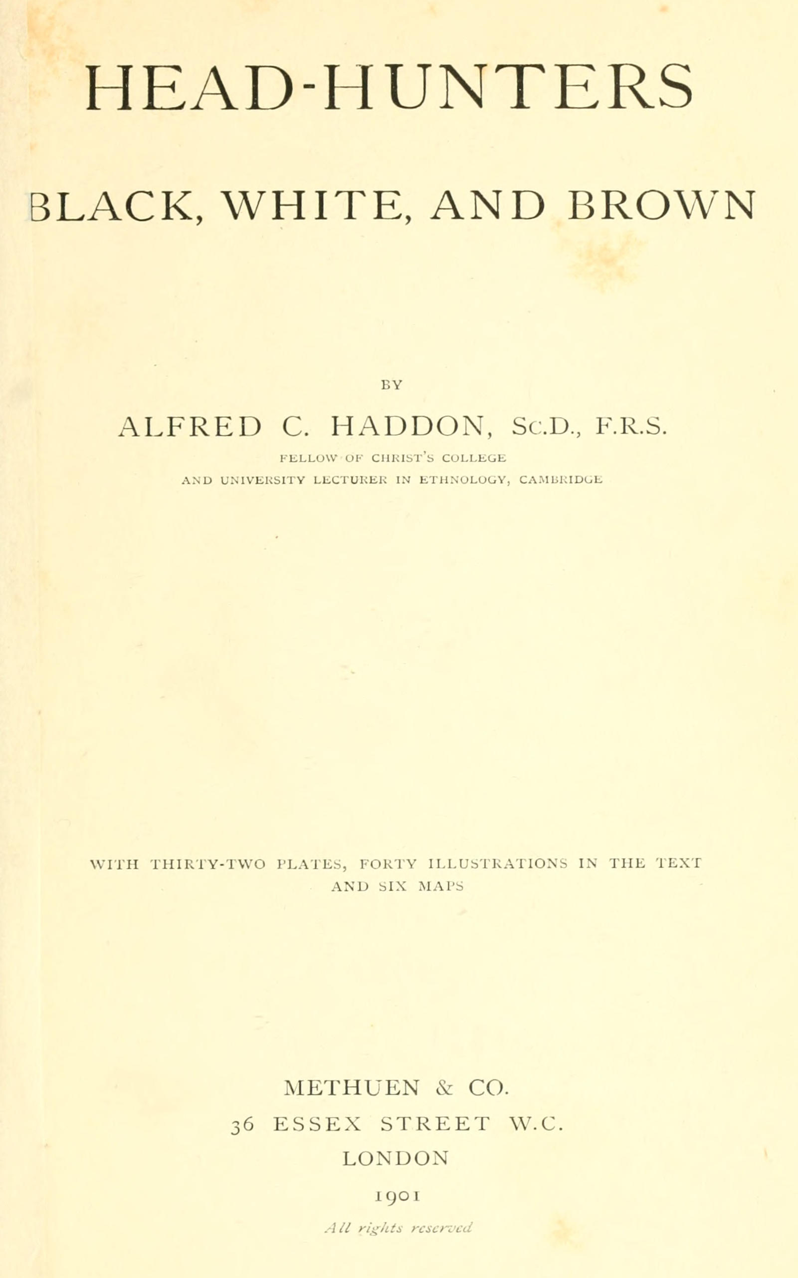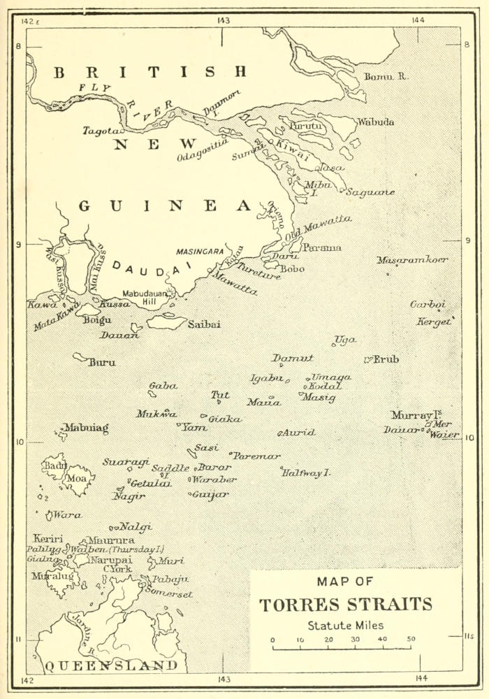 In order to render my descriptions of the places and people more continuous I have practically ignored the exact order in which events happened or journeys were made. For those who care about chronology I append a bare statement of the location of the various members of the expedition at various times. I have also not hesitated to include certain of my experiences, or some of the information I gained, during my first expedition to Torres Straits in 1888-9; but the reader will always be able to discriminate between the two occasions.