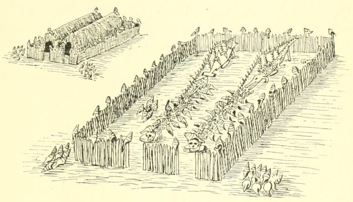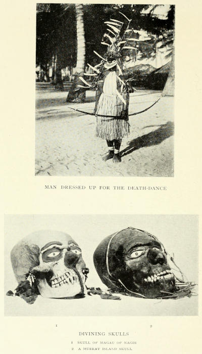 | Our party breaks up. Saibai: Clan groupings—Vaccination marks turned to a new use—Triple-crowned coconut palm—A two-storied native house. Tut: Notes of a former visit—Brief description of the old initiation ceremonies—Relics of the past. Yam: A Totem shrine. Nagir: The decoration of Magau’s skull “old-time fashion”—Divinatory skulls—The sawfish magical dance—Pictographs in Kiriri. Muralug: Visit to Prince of Wales Island in 1888—A family party—War-dance | Page 170-189 |