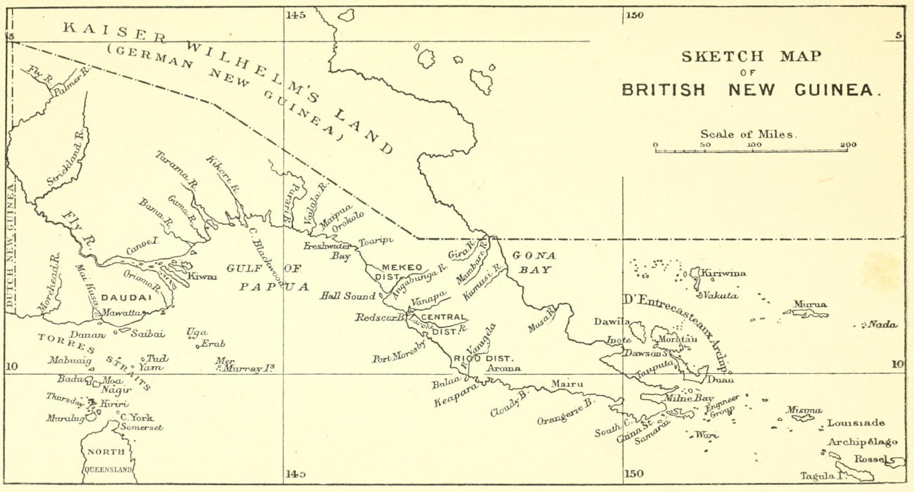 | The Olive Branch—Passage across the Papuan Gulf—Delena—Tattooing—A Papuan amentum—A sorcerer’s kit—Borepada—Port Moresby—Gaile, a village built in the sea—Character of the country—Kăpăkăpă—Dubus—The Vatorata Mission Station—Dr. and Mrs. Lawes—Sir William Macgregor’s testimony to mission work—A dance | Page 197-210 |
