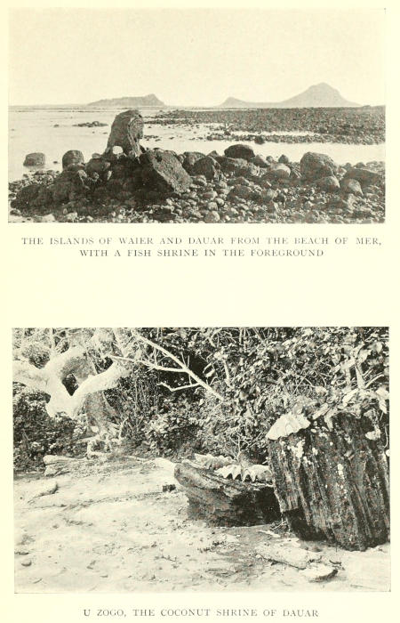 | Totemism in Mabuiag—Significance of Totemism—Advantage of Totemism—Seclusion of girls—The Sacred Island of Pulu—The scenes of some of Kwoiam’s exploits—The Pulu Kwod—The stone that fell from the sky—The Kwoiam Augŭds—Death dances—Test for bravery—Bull-roarer—Pictographs—The Cave of Skulls—The destruction of relics—Outline of the Saga of Kwoiam—Kwoiam’s miraculous water-hole—The death of Kwoiam | Page 132-147 |
