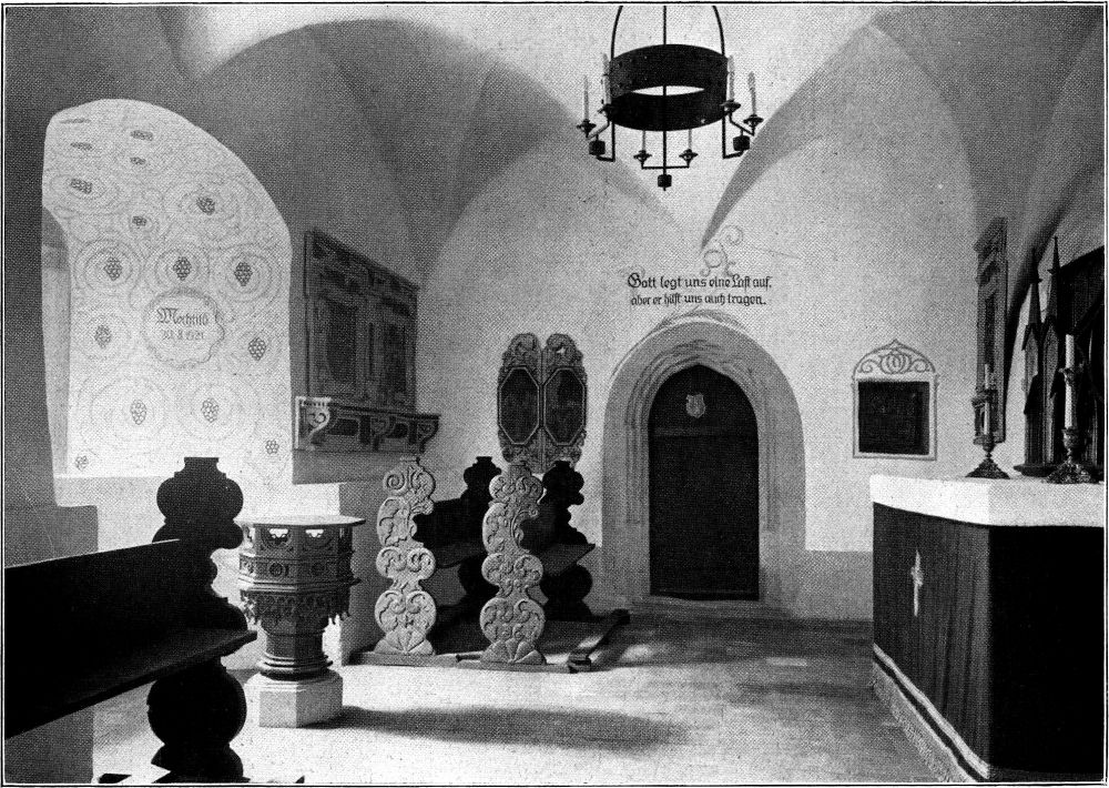 Daß die erneuerte Burg in ihrer Wirkung vom Tal aus fast ganz der alten gleicht, wurde schon erwähnt. Aber auch, wenn man sie vom Burghof oder von der Plattform des Bergfrieds aus betrachtet, oder wenn man die erneuerten Teile aufmerksam durchwandert, kann man allen Beteiligten die rückhaltlose Anerkennung nicht versagen, daß hier ein schwieriges Wiederherstellungswerk in selbstloser Gesinnung und aus echt geschichtlichem Geiste mit ausdauerndem Fleiß und vortrefflichem Geschick geleistet worden ist. Natürlich ist der Neubau kein sklavisches Abbild des alten. (Abb. 6.) Einige Giebelkonstruktionen und die damit zusammenhängende Gestaltung des Daches, das beim alten Schloß wie ein schmiegsames Fell in sich zusammenhängend über alle die verschiedenartigen und verschiedenhohen Bauglieder gezogen worden war, sind teils in Rücksicht auf die Witterungseinflüsse und die Feuersicherheit, teils auch, weil die Kunst der heutigen Zimmerleute nicht mehr der des sechzehnten Jahrhunderts gleicht, etwas verändert worden. Auch reichten die vorhandenen Mittel nicht dazu aus, z. B. den im zweiten Oberstock des Wohnflügels vorhanden gewesenen »Rittersaal mit den schönen gewundenen Holzsäulen[329] und den geschnitzten Wappen am unteren Ende der Hängesäulen« zu erneuern, ebenso mußte die anfangs geplante Wiederherstellung der erst beim Brande hinter später eingezogenen Decken wieder aufgefundenen schönen Kassettendecken des sechzehnten Jahrhunderts und der wuchtigen profilierten Balken der Kosten wegen unterbleiben. Reste dieser profilierten Balken sind noch jetzt im gotischen Tor zu sehen. Auch das übrigens sehr schöne Herrenzimmer im halbrunden Turm des Gesellschaftsflügels ist durch den allzu dünnen und schmucklosen Ausfall der beiden Deckenbalken in seiner Wirkung geradezu beeinträchtigt worden. Aber gerade durch diese von der Not erzwungenen Mängel wird die erneuerte Burg Scharfenstein zugleich auch ein Denkmal unserer ernsten und schweren Zeit. Anderseits kann man manche Änderung der inneren Raumverteilung geradezu für eine Besserung des früheren Zustandes ansehen. So die bessere Unterbringung der Kinder und ihrer Erzieherin im Wohnflügel, die Herstellung einer offenen Halle im zweiten Oberstock des Gesellschaftsflügels und die Schaffung einer Burgkapelle, die es bisher trotz des »Kirchenflügels« im Schlosse nicht gab. Zur Burgkapelle (Abb. 7) ist ein sehr schönes, zuletzt als Speisegewölbe benutztes Gemach im Erdgeschoß des Wohnflügels rechts von der Haupttreppe umgewandelt worden. Das durch hohe Stichkappen gegliederte Tonnengewölbe sowie die spätgotischen Türgewände bedurften keiner Veränderung. In der Mittelachse des Fensters steht der Taufstein, dem Fenster gegenüber ist ein schlichter, brauner gotischer Holzaltar errichtet, das Gestühl stammt aus Schlesien, Grabmäler längst heimgegangener Familienglieder heben sich von den schlichten, weißen Wänden ab (Abb. 7). Besonders ergriffen hat mich das von V. Saila in Stuttgart gemalte Glasfenster: unter dem Kreuz sieben Engelsköpfchen mit den Anfangsbuchstaben der sieben Kinder, die dem gräflichen Paare bei der Einrichtung der Kapelle geboren waren. Eins davon, Mechtild, ist am 30. August 1921, also im Jahre des Brandes zur Welt gekommen. Im Ganzen sind es drei Knaben und vier Mädchen. An der dem Eingang gegenüberliegenden Tür steht der Spruch: