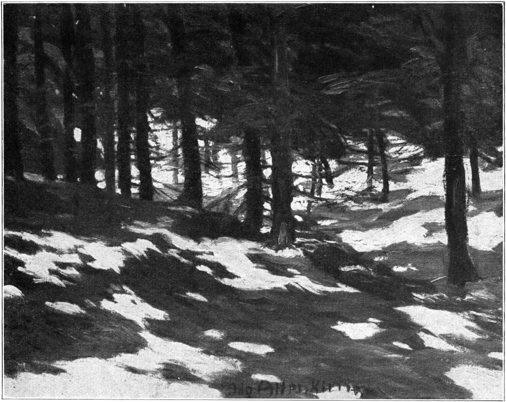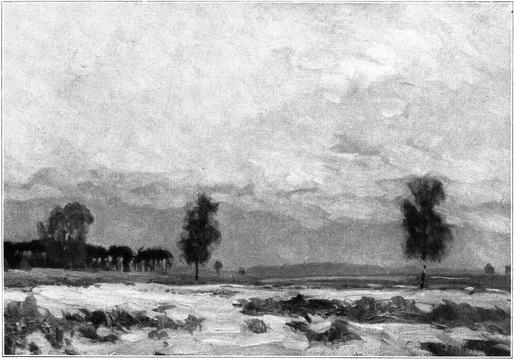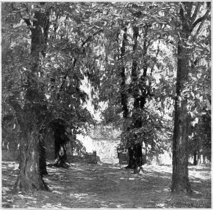 Meisterhaft ist seine Beherrschung der Luft. Sie umspielt alles Dargestellte auf seinen Bildern und gibt ihm die körperliche Erscheinung. Sie wird selbst zur Erscheinung. Sie rieselt durch das Goldlaub herbstlicher Birken, sie zittert über dem Sande in heißer Mittagssonne, sie liegt als feiner duftiger Schleier über der Ferne und hüllt kahle Bäume an trüben Tagen in melancholischen Flor. Ueber[371] morgenkühlen Wasserspiegeln steigt sie als silberner Atem auf und zwischen den feuchten Stämmen stimmungsschwerer Tauwetterlandschaften dampft sie als weicher Brodem. Wundervoll, nur in der Reproduktion leider nicht wiederzugeben, glitzert die geradezu kristallisierte Luft im Geäst der vom Rauhreif verzauberten Bäume. Man denkt an Alexander von Villers schönen Satz: »Die Sonne wäre außerstande, den dichtesten Busch im Walde so innerlich zu beleuchten, wie dieser Staub des Himmels es mit seiner weichen Ruhe vermag.«
