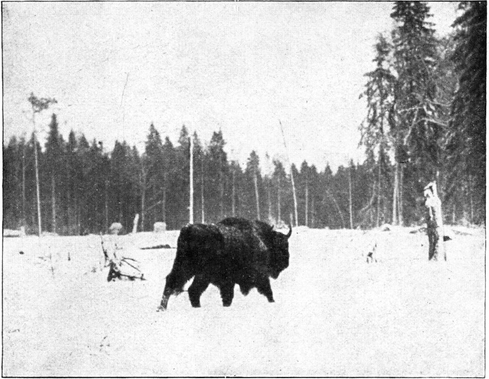 »Meine erste Begegnung mit dem Wisent erfolgte im Januar 1918, als ich von meiner Dienststelle im Westen zur Leitung photo- und kinematographischer Aufnahmen, die der Bund für Vogelschutz in Stuttgart vornehmen ließ, nach Bialowies beurlaubt worden war. Der erste Eindruck, den ich von den Tieren erhielt, enttäuschte allerdings etwas. Die Herde von siebzehn Stück, die auf einem Kahlschlag stand und der strengen Kälte und des hohen Schnees wegen von Zeit zu Zeit in Waldheu etwas Futter dargeboten erhielt, ließ wenig von der erwarteten[374] und den Tieren sonst auch eigenen Wildheit ahnen. Die Winterfütterung des Wisents war unter russischer Herrschaft zu einer alle gebotenen Grenzen überschreitenden Regel geworden und hatte das Wesen und die Natur der Tiere in der denkbar ungünstigsten Weise beeinflußt. Der Wisent war verweichlicht worden, und die dabei alle Scheu vor dem Menschen abgelegten Urwaldriesen muteten manchesmal fast wie halbzahme Stallrinder an. Diese große Vertrautheit wurde dem Tiere besonders in der Zeit der Besitzkämpfe um das Waldgebiet zum Verhängnis; sie machte den Abschuß spielend leicht und manch einer der Recken erlag der tötlichen Kugel, vor der ihm eine größere Scheu sicher bewahrt hätte[4]. Unter der deutschen Verwaltung war allerdings mit der bis dahin geübten Fütterungsweise gebrochen worden; die Tiere, die sich so sehr an die Fütterung gewöhnt hatten, daß sie unter russischer Herrschaft bereits im Oktober, wenn der Wald ihnen noch hinreichende Aesung bot, an den Fütterungsstellen sich einfanden[5], erhielten nur jetzt mehr ausnahmsweise bei strengster Kälte und tiefem Schnee in mäßiger Weise (zumeist in gefällten Weichhölzern: Aspen usw.) Futter dargeboten. Der Erfolg dieser Methode war ein guter; der Wisent wurde wieder zäher und ausdauernder und man wird Escherich Recht geben müssen, wenn er einen großen Teil der günstigen Erfolge der deutschen Hege, die die Ergebnisse der zarischen wesentlich übertrafen, auf diese Abkehr von der ehemals geübten Fütterungsweise zurückführt.