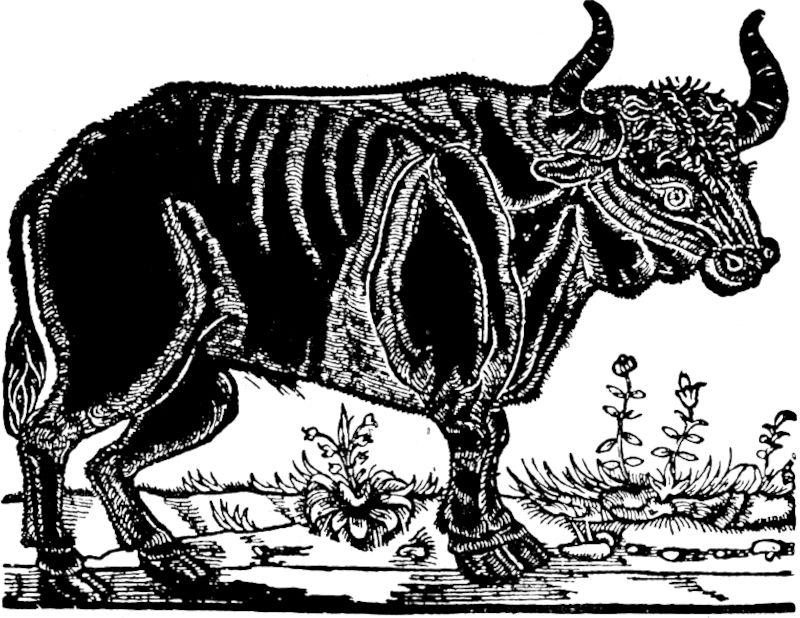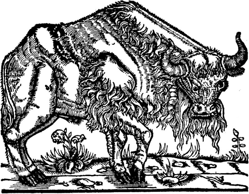 [7] Eine der bekanntesten und trotz einer gewissen Steifheit in der Darstellung auch wertvollsten Abbildung verdanken wir dem österreichischen Gesandten Freiherrn von Herberstain, der um die Mitte des sechzehnten Jahrhunderts den Ur sowohl wie auch den Wisent in Polen kennen lernte und beide (wohl noch in seinem Besitze befindlichen ausgestopften Stücke) zeichnen ließ und die Zeichnungen mit Beschreibungen der Tiere in seiner 1557 in Wien erschienenen »Moscovia« veröffentlichte. Ein anderes Urbild ist das sogenannte »Augsburger Urbild«, das der englische Zoologe Smith gegen Anfang des vergangenen Jahrhunderts bei einem Augsburger Altertumshändler entdeckte und 1827 in einer guten Wiedergabe veröffentlichte. Leider aber ist das Original inzwischen wieder verloren gegangen. – Die Herberstainschen Abbildungen sowohl wie das Augsburger Urbild habe ich unseren Ausführungen beigegeben.
