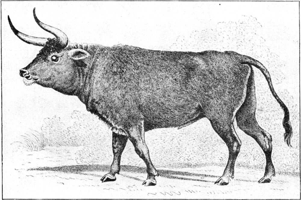 Die lange Zeit und bis fast in die Gegenwart hinein heiß umstrittene Frage, ob in Europa nur ein oder zwei Wildrinder vorgekommen sind, ist heute endgültig entschieden; wir wissen, daß zwei: der Ur und der Wisent, noch in historischer Zeit hier nebeneinander lebten. Neben aufgefundenen Resten des Ures, der sich bis ins siebzehnte Jahrhundert hinein am längsten in Polen gehalten hat, besitzen wir auch einige alte Abbildungen von ihm[7], die uns aufs überzeugendste die grundlegenden Unterschiede zeigen, die ihn von seinem Vetter, dem Wisent, trennten.