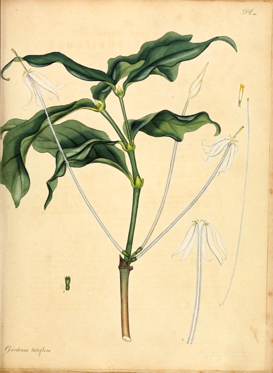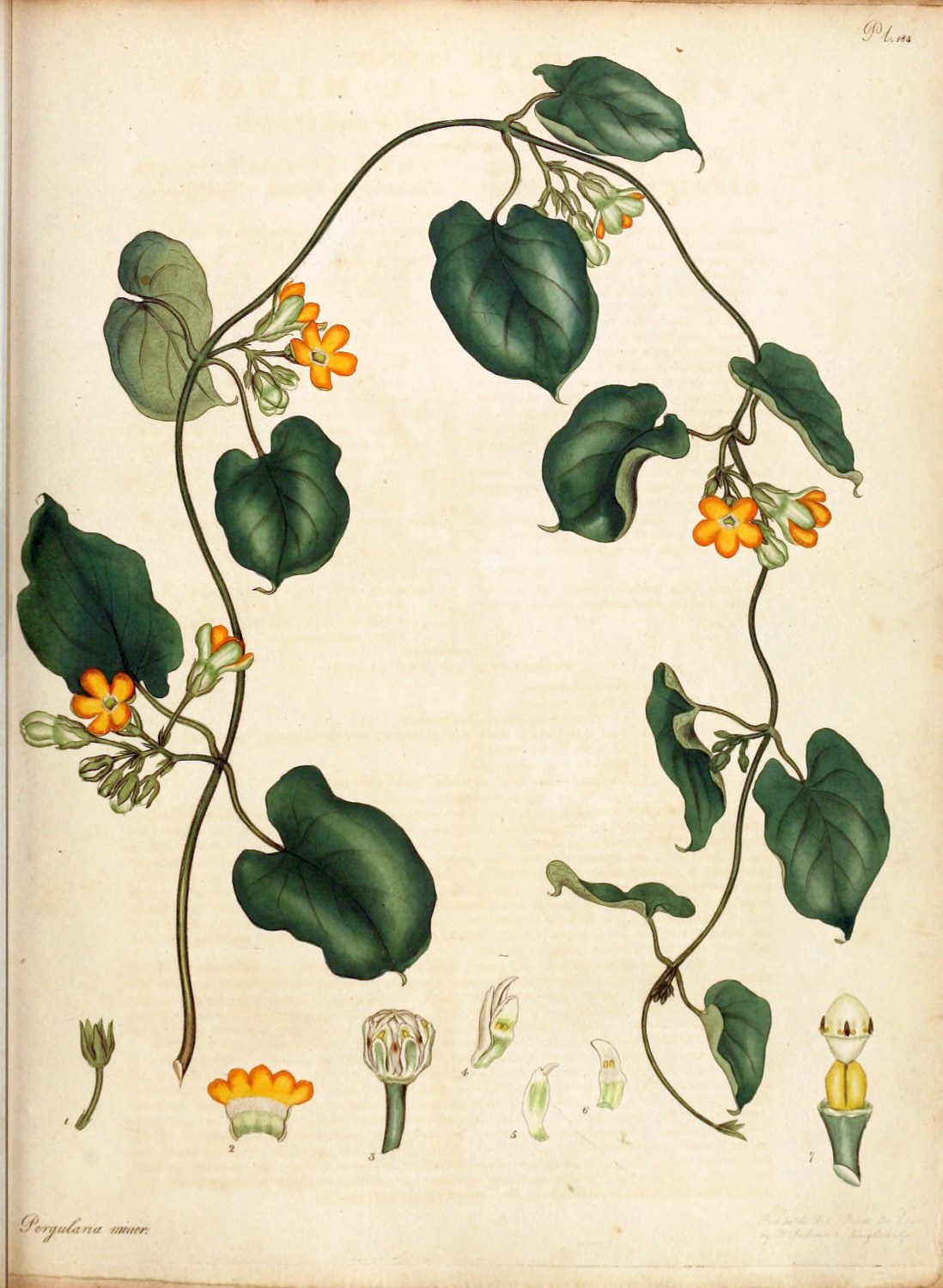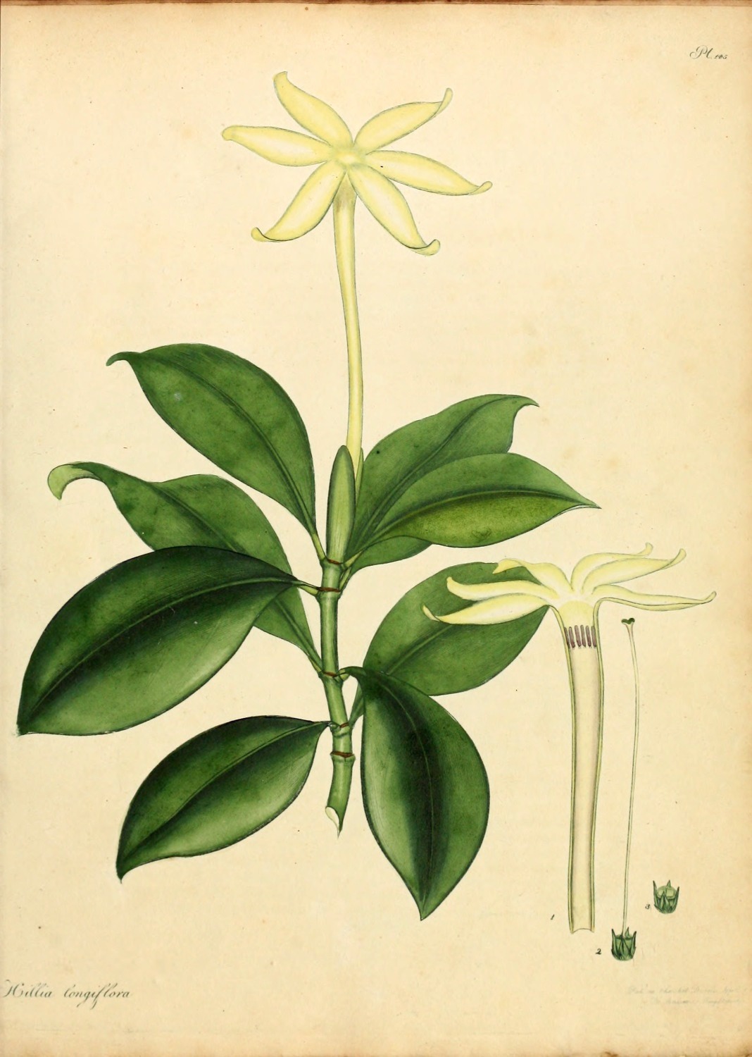 This species of Hillia was first introduced to our gardens in the year 1789, from the Island of Barbadoes, sent in plants, by Mr. J. Elcock, to Messrs. Lee and Kennedy, Hammersmith. Originally this shrub was specifically termed, parasitica by professor Jacquin, when he first formed, and titled the Genus, after Dr. J. Hill, of voluminous memory; from a supposition that it was to be found growing, only, upon some other plant; a circumstance, which being denied by Swartz, he has altered it to longiflora. We have followed the latter name that ours may go in unison with the author of the last Species plantarum now publishing by Willdenow, as well as professor Martyn, who in his edition of Miller’s Dictionary has followed Swartz; they appearing to be the most accurate, as well as the most read and followed of any modern Botanical authorities. It is a tender hot-house plant, strikes easily from cuttings, thrives in rich mould and flowers about the end of February. To the Right Hon. Lord Viscount Valentia we are indebted, for the specimen from which our figure was taken, sent from his Lordship’s famed collection at Arley near Bewdley, Staffordshire; where, we believe, it has flowered for the first time in England.[Pg 5]