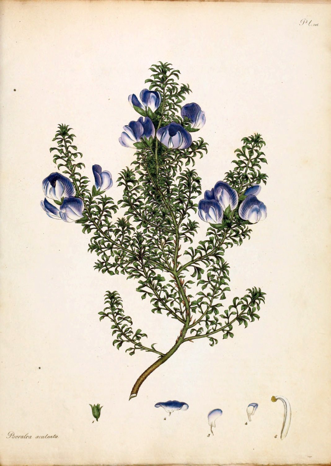 The Prickly Psoralea is not a new plant in our collections; for, it was first introduced by Mr. F. Masson to the Royal Gardens at Kew, as we learn from the Catalogue, in the year 1774. But although so long a sojourner with us, it is not found in many collections, owing to the difficulty in its increase, as it seldom ripens its seeds; and cuttings, the only remaining method, but seldom succeed; although by taking them from a vigorous growing plant and giving them the assistance of the bark-bed of the hothouse, early in March, a few plants have been procured occasionally. Our drawing was made from a most beautiful plant in the Clapham Collection, last year, in the month of August.[Pg 9]