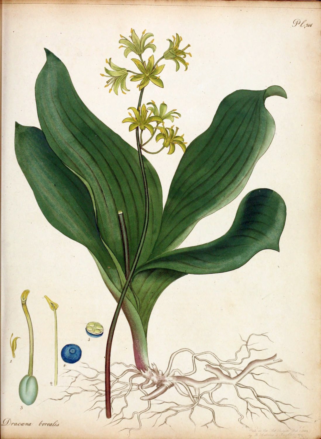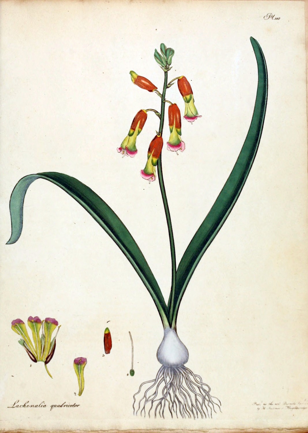 About the year 1789, this very handsome species of Lachenalia was first received by Messrs. Lee and Kennedy, Hammersmith, from the Cape of Good Hope, sent in bulbs to them by J. Pringle, Esq. It is as hardy as the L. tricolor, to which it much inclines, well known to collectors, and is equally easily propagated; an excellent figure of which is to be found, in the 82d Plate of the Botanical Magazine of Mr. Curtis. The L. quadricolor is given as a synonym by Willdenow to L. pendula, a plant we have already figured, and from which this stands quite distinct in the conformation of every part; they are both to be found in the 2d Vol. of Icon. of Jacquin, from whom we copy our specific title, the pendula, t. 400, the quadricolor, t. 396.[Pg 17]