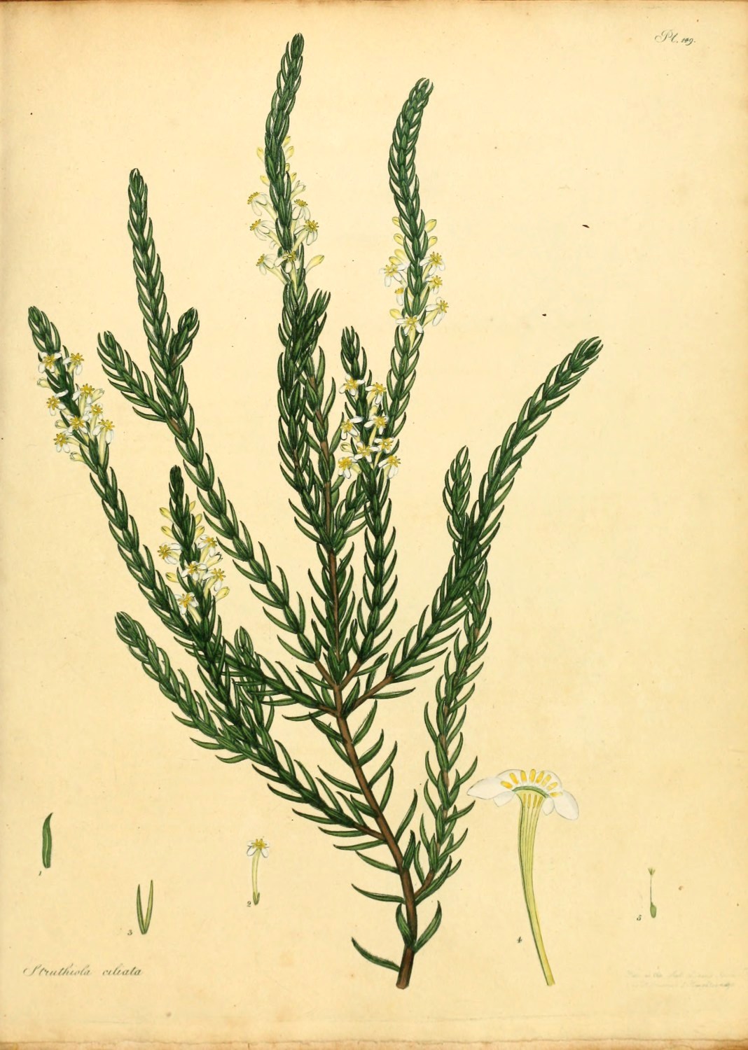 Struthiola foliis ovato-lanceolatis, mucronatis, ciliatis, concavis, quadrifariam imbricatis, apice incurvis; corolla subalbida.
