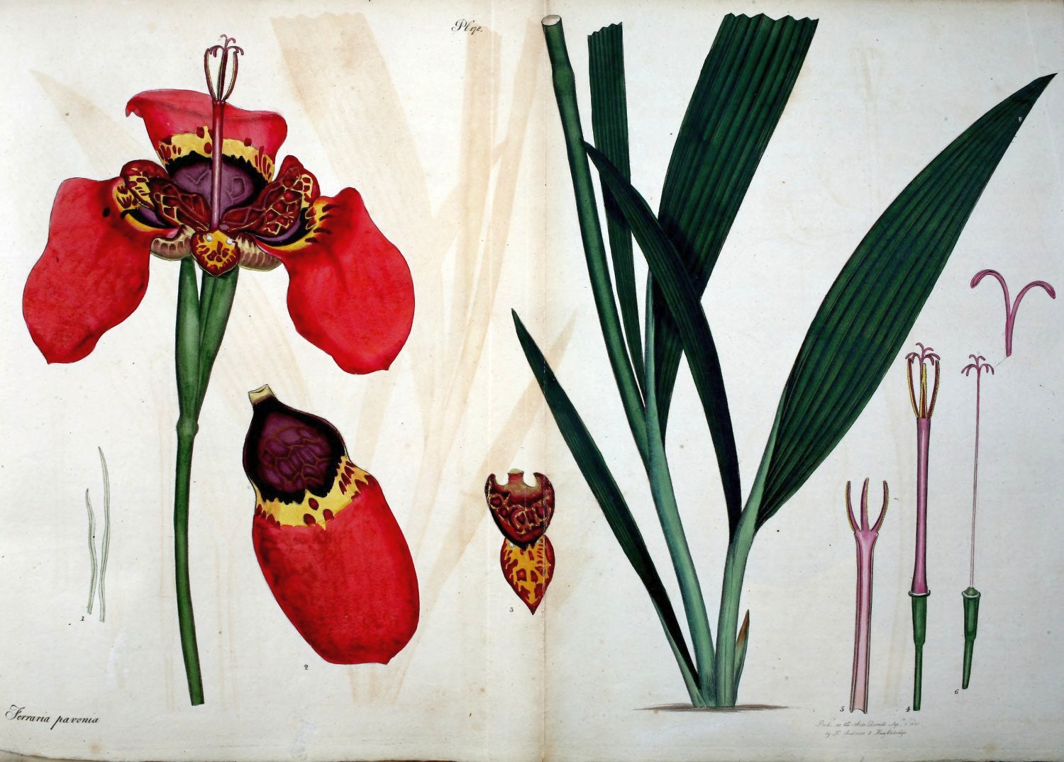 Gladiolus foliis lineari-ensiformibus, glabris; corolla ringente; laciniis longissimis, acuminatis, undulatis, subæqualibus, tribus inferioribus in medio macula oblonga notatis.