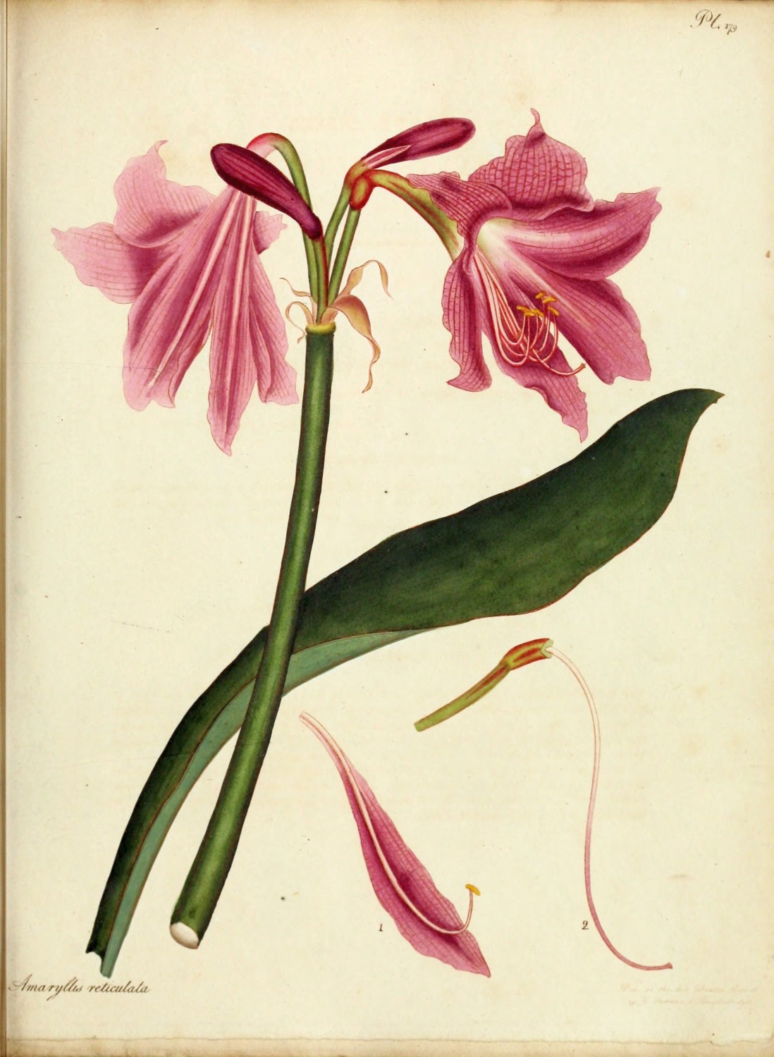 The Gladiolus here figured, represents a variety of one of the most errant species of the Genus, known commonly by the name of Spade Gladiolus, and of which we have drawings of eight, quite distinct; yet all, unquestionably, originating in one common parent. It was introduced in 1796, from the Cape of Good Hope, by Mr. R. Williams, nurseryman of Turnham-green, near Brentford; is a very hardy greenhouse bulb, increases from the root in abundance, if planted in very sandy peat earth, and flowers about the Month of April, or May.[Pg 13]