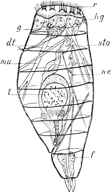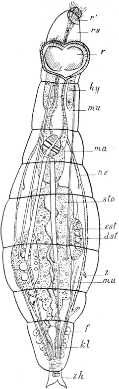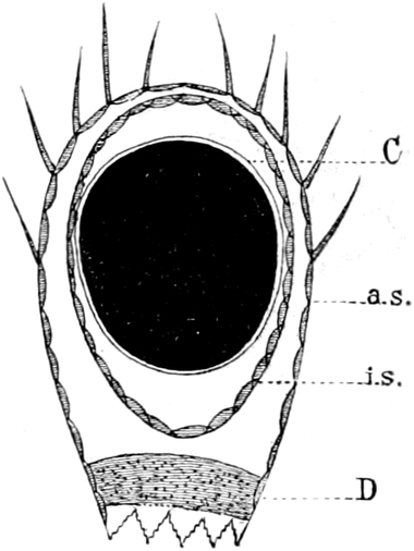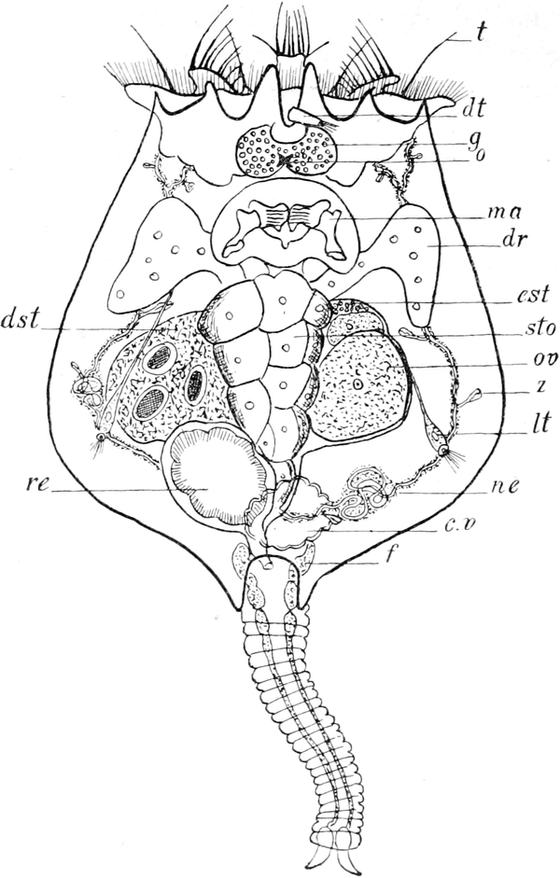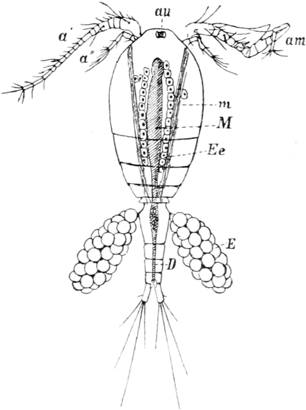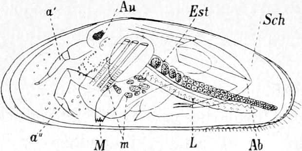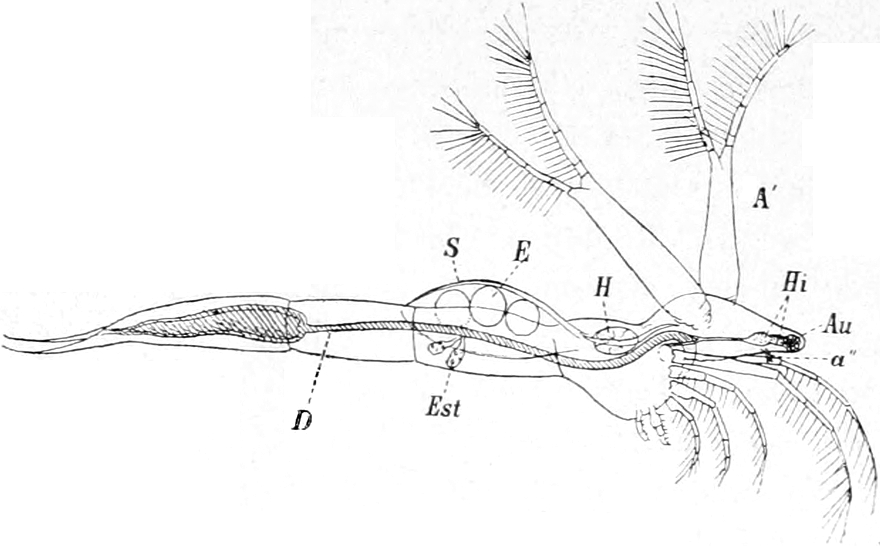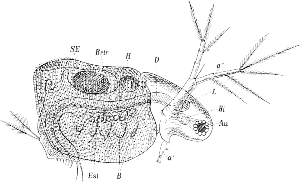 Der Körper dieser wegen der Art ihrer Bewegung „Wasserflöhe“, wegen der verzweigten Fühler (Hörner) „Cladocera“ genannten Entomostraken ist nicht in deutliche Segmente geteilt. Nicht einmal immer ist der Kopf durch einen kleinen Einschnitt vom Rumpfe abgesetzt. Letzterer ist oft von einer Schale umschlossen. In dieser Schale, deren Form die äusseren Umrisse des hinteren Körperteiles bedingt, liegt der Leib frei beweglich. Die beiden Hälften der Schale sind am Rücken mit einander verwachsen, auf der Oberfläche häufig mit feinen Skulpturen versehen und gewöhnlich so durchsichtig, dass man die inneren Organe beobachten kann. Nicht immer ist der Leib ganz in der Schale verborgen, sondern oft nur zu einem ganz geringen Teil davon überdeckt. In wenigen Fällen fehlt jede Andeutung einer Schale. Am Kopfe stehen wie zwei Hörnchen die hinteren zweiästigen Fühler empor, welche zum Schwimmen dienen. Das erste Paar ist zu kurzen Stummeln rückgebildet, welche als Sinnesorgan mit sehr feinen perzipierenden Apparaten ausgestattet sind und beim Männchen zugleich als Greiforgan funktionieren. Von Mundteilen besitzen die Wasserflöhe jederseits einen Ober- und einen Unterkiefer. Die Beinpaare sind wie bei den Copepoden zweiästig. Der äussere Ast ist blattförmig verbreitert und vertritt die Stelle von Kiemen. Die Zahl der Beinpaare schwankt zwischen vier und sechs. Die das Zentralnervensystem darstellende Ganglienkette hat, da die Knoten sehr nahe zusammenrücken, nur eine geringe Länge. Auffallend gross und schön ist das einen bedeutenden Teil des Kopfes ausfüllende Auge. Es ist in einem beständigen Zittern begriffen und besteht eigentlich aus zwei verwachsenen Teilen. Ohne besondere Mühe vermag man die daran sich ansetzenden Muskeln und Nerven zu sehen. Die lichtbrechenden Körper (Linsen) glänzen sehr schön und heben sich scharf vom Pigment der inneren Teile[S. 367] des Auges ab. Bei den meisten Arten verläuft der Darm gerade durch den Körper und nur in wenigen Fällen bildet er eine Schlinge. Noch im Kopfteil entspringen an seiner Oberseite zwei gegen die Augen vorspringende kurze Schläuche, in welchen die Leberzellen untergebracht sind.