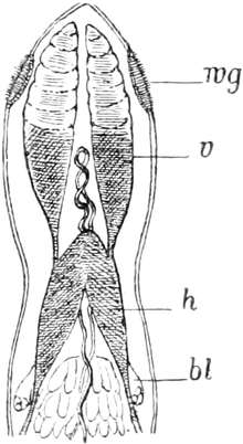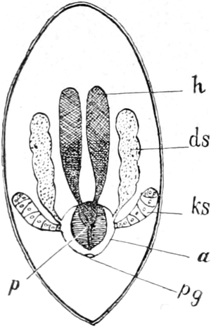 Über die Befruchtungserscheinungen am Eie hat Weismann[122] eine Reihe gründlicher Untersuchungen angestellt. Die Wasserflöhe verlassen das Ei in einer Gestalt, welche der der erwachsenen Tiere schon sehr ähnlich ist, machen also kein freilebendes Cyclopsstadium durch.