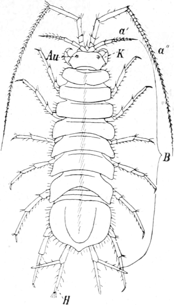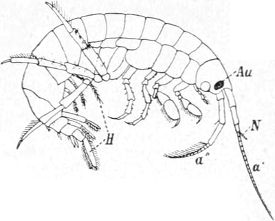 Der Körper dieser besonders in klaren Gebirgsbächen und Quellen ungemein häufigen Tiere ist seitlich zusammengedrückt und wohl gegliedert. Kopf und erstes Brustsegment sind mit einander verwachsen. Die beiden Fühlerpaare haben annähernd gleiche[S. 375] Länge; am ersten entspringt ein kleiner Nebenast. Mundwerkzeuge und Beinpaare sind in gleicher Anzahl wie bei den Asseln vorhanden. Die Endglieder der ersten zwei Brustbeinpaare sind zu kleinen Greifhänden umgestaltet. An der Innenseite der meisten Brustbeine sitzen als Kiemen funktionierende blasige Gebilde, beim Weibchen ausserdem Brutplatten. Die Beine des Hinterleibes sind in zwei gleichartige Äste gespalten. Die drei ersten Paare der Hinterleibsbeine unterscheiden sich in der Form von den folgenden und dienen zum Schwimmen und zur Erzeugung stetigen Wasserwechsels an den Kiemen, weshalb sie auch in der Ruhe immerwährend schwingen. Während der Darm dem der Wasserassel sehr ähnlich und ebenfalls mit zwei Paaren von Leberschläuchen versehen ist, lässt sich am Herzen insofern eine höhere Entwickelungsstufe erkennen, als es weiter vorn im Körper seinen Platz hat und sowohl gegen den Kopf zu als auch nach hinten Gefässe entsendet. Die Gliederung des Nervensystems entspricht der Segmentierung des Körpers. Die beiden rundlichen Augen sind ähnlich zusammengesetzt wie bei den höheren Kerfen. Die Antennen tragen blasse Riechkolben. Die Geschlechtsorgane mit ihren Ausmündungen verhalten sich wie bei den Isopoden. Die Eier und Jungen werden ebenfalls zwischen den Brustbeinen von den Brutplatten bedeckt getragen. Die Art, wie die bei uns gemeinste Gattung Gammarus (Fig. 79) sich im Wasser bewegt, wurde eingangs geschildert. Man findet diesen Flohkrebs am sichersten unter Steinen, in deren Nähe faules Laub sich vorfindet. Oft schimmert ein kleiner roter Körper durch die Leibeswand. Es ist dies ein Echinorhynchus, ein häufiger Parasit. Eine blinde Abart des Gammarus lebt, ebenso wie die blinde Assel, in tiefen Brunnen oder Höhlen.