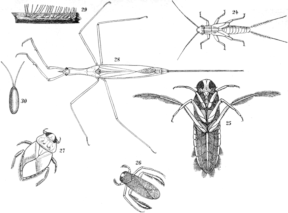 6. Schnabelkerfe: a) Hydrometriden. — b) Notonecta, Plea. —