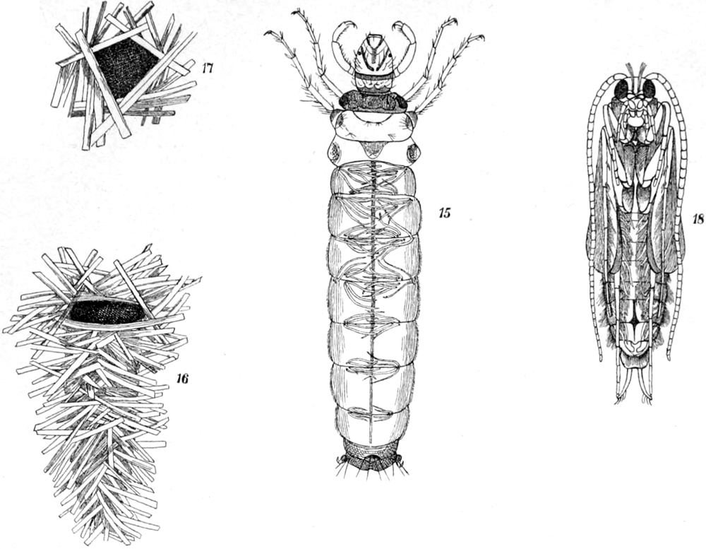 Limnophilus, Polycentropus, Hydropsyche. — b) Sialis, Sisyra. —