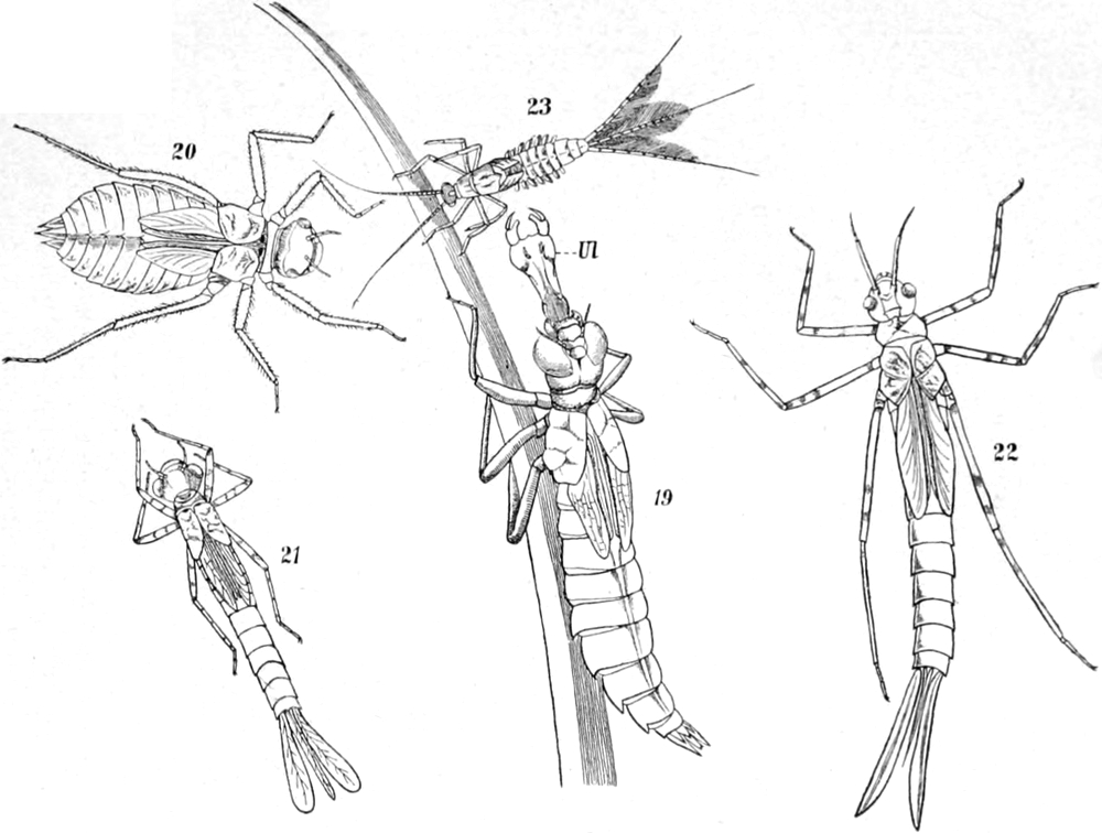 Calopteryx, Gomphus. — b) Eintagsfliegen: Chloëon, Caenis. —