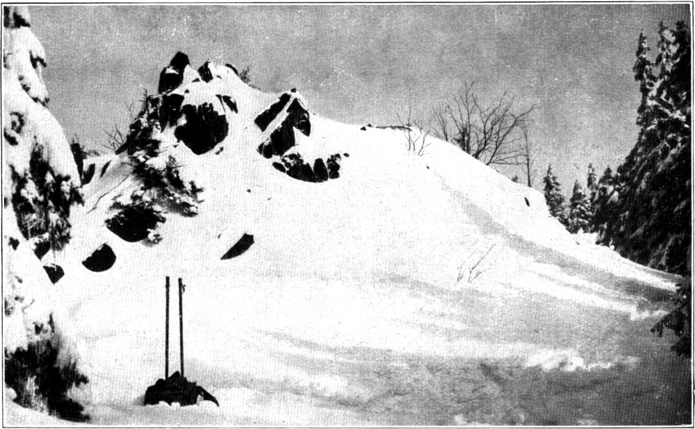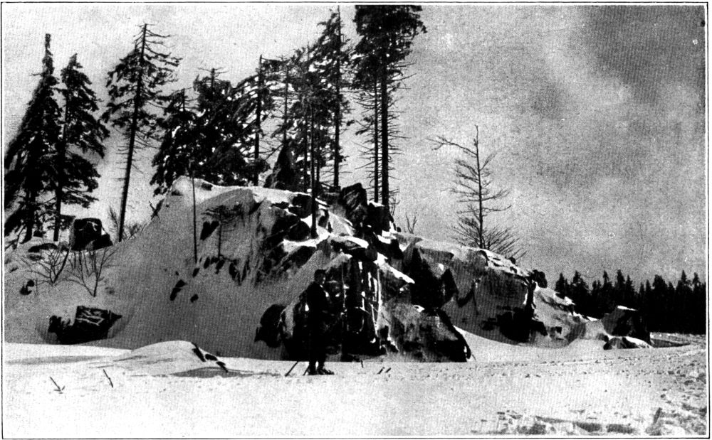 Am nächsten Tage brach nämlich im Flachland der Frühling aus, was die Dresdner veranlaßte, schöne Spaziergänge in den Großen Garten zu machen. Wir aber erlebten nach dem bekannten Gesetz von der Tücke des Objekts wieder einmal die Kehrseite von der Medaille, indem es fürchterlich pappte, als wir am Morgen am Raupennest (Name einer alten Bergherrenfamilie) emporkletterten. Ich gedachte zunächst wie immer an dieser Stelle meiner schönen Konfirmationsuhr, die ich vor zehn Jahren hier beim Hinabrollen nach Altenberg verlor, ohne sie jemals wiederzusehen, und dann faßten wir angesichts der zwanzig Zentimeter dicken Schneeschicht, die an den Brettern klebte, den männlichen Beschluß, die geplante Strobnitzexpedition aufzugeben und einen Spaziergang nach den nahegelegenen Lugsteinen zu machen. Also begaben wir uns zunächst nach Georgenfeld, dessen spaßige Häuselreihe im Winter noch putziger aussieht als sonst. Auch die übrigen Siedelungen der Hochfläche, Alt-Georgenfeld und Zinnwald mit ihren zerstreuten Schindelhäusern hatten in dem Winterkostüm nur gewonnen, zumal die sonst die Landschaft verunzierenden Halden der Wolframwerke auch mildtätig vom großen weißen Tuch eingehüllt worden waren. Einen besonders schönen Überblick über dieses Kammgebiet wie über die böhmischen Riesen hat man von dem glücklicherweise[397] noch nicht mit Wegweisern bedachten Kleinen Lugstein, der nur um zehn Meter hinter der höchsten Erhebung dieses Gebiets, dem Kahleberg zurücksteht. Seine schroffen Porphyrklippen ragten nur mit den Spitzen aus dem dicken Schneepanzer heraus, der ihn jetzt umgibt, so daß er geradezu alpin aussah. Vielleicht könnte man mit Hilfe einer Tafel mit der Inschrift: »Nach dem sächsischen Matterhorn« den Fremdenverkehr an dieser Stelle etwas heben und für die Herbeischaffung der Konservenbüchsen, Apfelsinenschalen und Bemmenpapiere sorgen, die diesem in jeder Hinsicht reizvollen »Gipfel« zur Zeit noch fehlen.