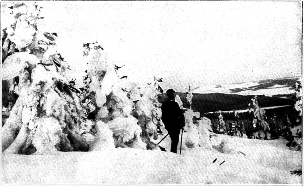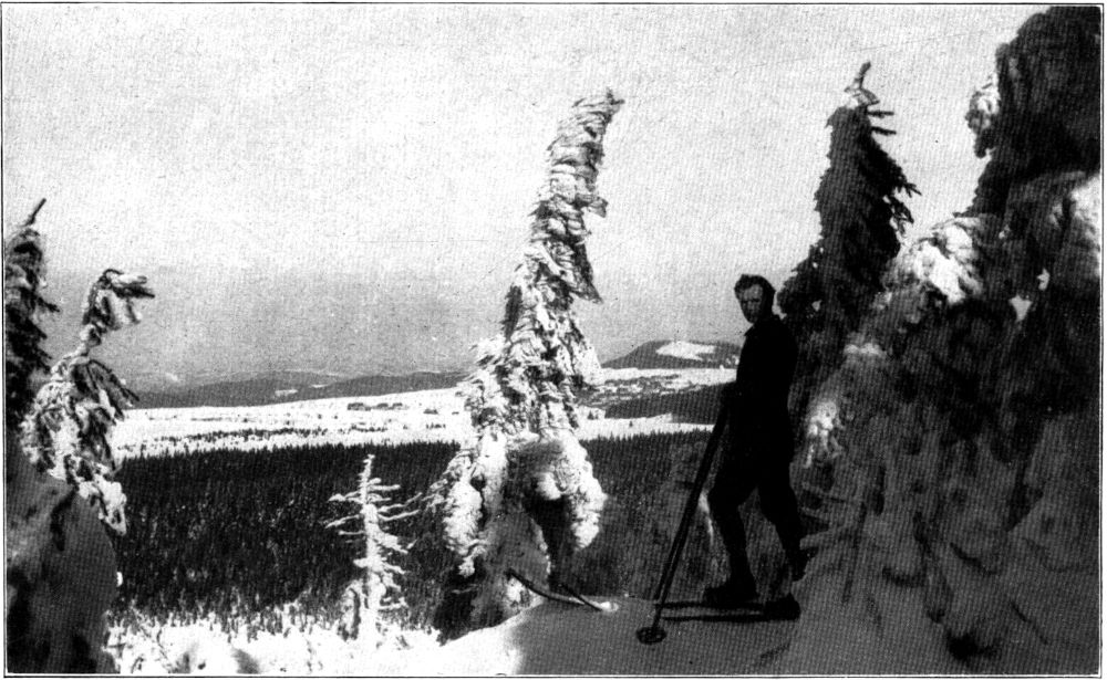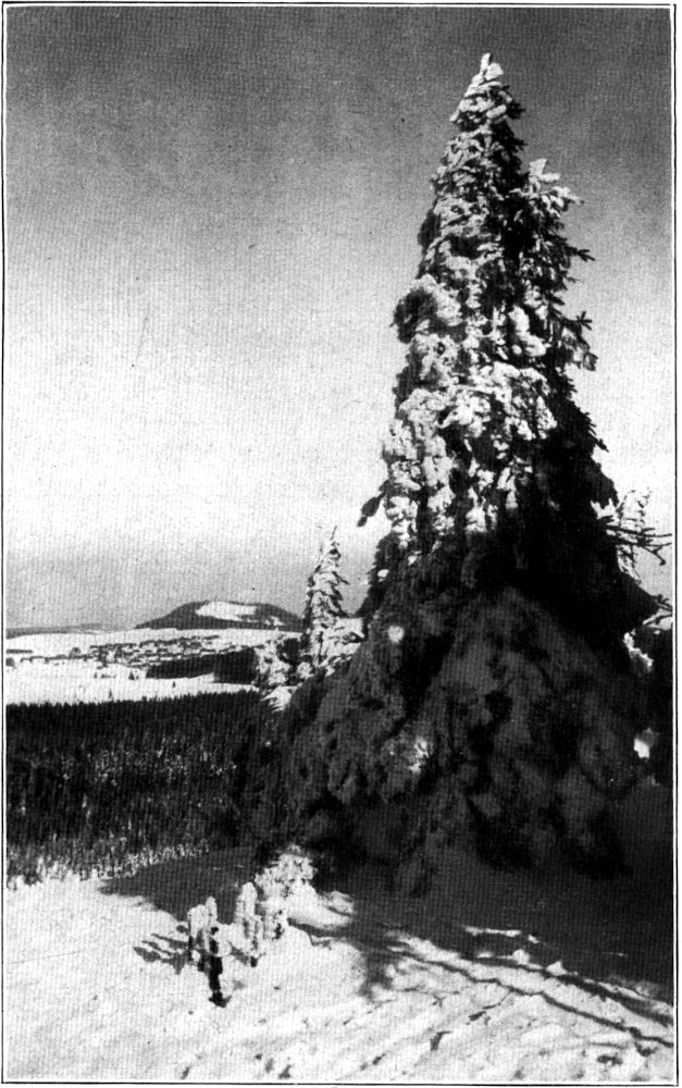Seinen etwas niedrigeren Bruder, den Großen Lugstein, ließen wir diesmal rechts liegen und schoben uns gleich über das Georgenfelder Moor, den »See«, der den Neugraben speist, mit seinen kaum noch sichtbaren Legföhren in den Märchenwald am Niklasberger Weg, von dessen bizarren Baum- und Schneeformen, die Menschen, Bären, Embryonen und Riesenschnecken glichen, unser Bild einen bessern Begriff gibt, als es irgendwelche Worte vermöchten. Auf der Suche nach immer neuen Überraschungen waren wir so tief ins Dickicht geraten, daß wir erst nach langem Suchen die Lichtung entdeckten, an deren Rande der Böhmische Lugstein, eine dreigeteilte Porphyrklippe, die von schönen Wetterfichten gekrönt wird, wie eine Burg sich aufbaut. Unter wehmütigem Gedenken an die Heidelbeermengen, die ich einst mit meinen Kursteilnehmern an dieser Stelle vertilgt hatte, schlugen wir den Weg nach dem oberen Weißeritztal ein. Merkwürdigerweise funktionierte trotz des mäßigen Schnees die Abfahrt nach Kalkofen ausgezeichnet, was meinem Schneeschuh veranlaßte, gerade in diesem Augenblick sich der Bindung mit Hilfe einer abgebrochenen Schraube zu entledigen, so daß ich tiefen Groll im Herzen in[398] dem gemütlichsten Gasthaus des östlichen Erzgebirges anlangte, als meine Gefährten bereits beim zweiten Gang angekommen waren. Die nicht erst aus neuester Zeit datierende Bekanntschaft mit dem Kalkofener Gasthaus verdanke ich einem mir auch durch andere touristische Qualitäten sehr lieb gewordenen Schnapspascher, der sich unterdessen wieder seinem Originalberufe zugewandt hat, zumal die Früchte seiner beschwerlichen Tätigkeit ihm zerrannen, als er schließlich doch einmal erwischt worden war. Trotzdem mußten auch die Stammgäste das Lokal meiden, als die tschechische Krone so gestiegen war, daß selbst alles Entgegenkommen des Wirts die Valutadifferenz nicht mehr ausgleichen konnte. Nun sind wir die Hochvalutarischen geworden, und damit ist das freundliche Gasthaus aus seinem Dornröschenschlaf erwacht. Kaum kann die kleine Stube die Fülle der Gäste fassen, und ich sehe schon den fürchterlichen Augenblick nahen, wo die kleine Grenzkneipe dem Schicksal verfällt, dem schon so manches stille Grenzwirtshaus verfallen ist. Glücklicherweise hat unter dieser Entwicklung die Qualität bisher nicht gelitten, wie wir in ausführlicher Weise feststellten, indem wir die einst durch die Mitarbeit an Prager und Teplitzer Zeitungen verdienten Kronen hier in Sachwerten anlegten. Wir beschlossen darauf einstimmig, daß unsre noch unbeweibten Gefährten in Bälde eine »Böhmische« zu ehelichen und uns wöchentlich mindestens einmal zu Gansbraten mit Knödeln einzuladen hätten.