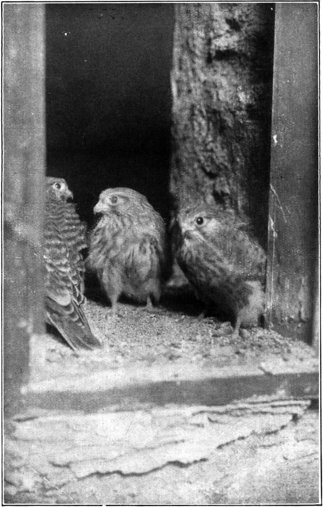 Einhalbneun Uhr abends ging es nun wieder leise die dunkle gewundene Turmtreppe hinauf, ausgerüstet mit Blitzlicht, um, wie Schillings es nennt, eine »Natururkunde« zu gewinnen. Leise und vorsichtig beim Scheine einer Taschenlampe wurde der Apparat gerichtet, das Blitzlicht fertig gemacht und das Fensterchen am Horste geöffnet. Es war nicht leicht, die Linse scharf einzustellen, da ein scharfer Wind und Gegenzug durch das geöffnete Fenster sauste und alle Vorsicht zu Schanden zu machen drohte, auch das Holzwerk des Turmes innen Unbequemlichkeiten bot. Auch die geringste Bewegung und das leiseste Geräusch merkten die jungen Falken, wurden unruhig, zogen sich bis an den Außenrand der Nische, den Rand des finsteren Abgrundes zurück, wobei ein oder zwei der Tierchen verdeckt waren und die Absturzgefahr drohte.