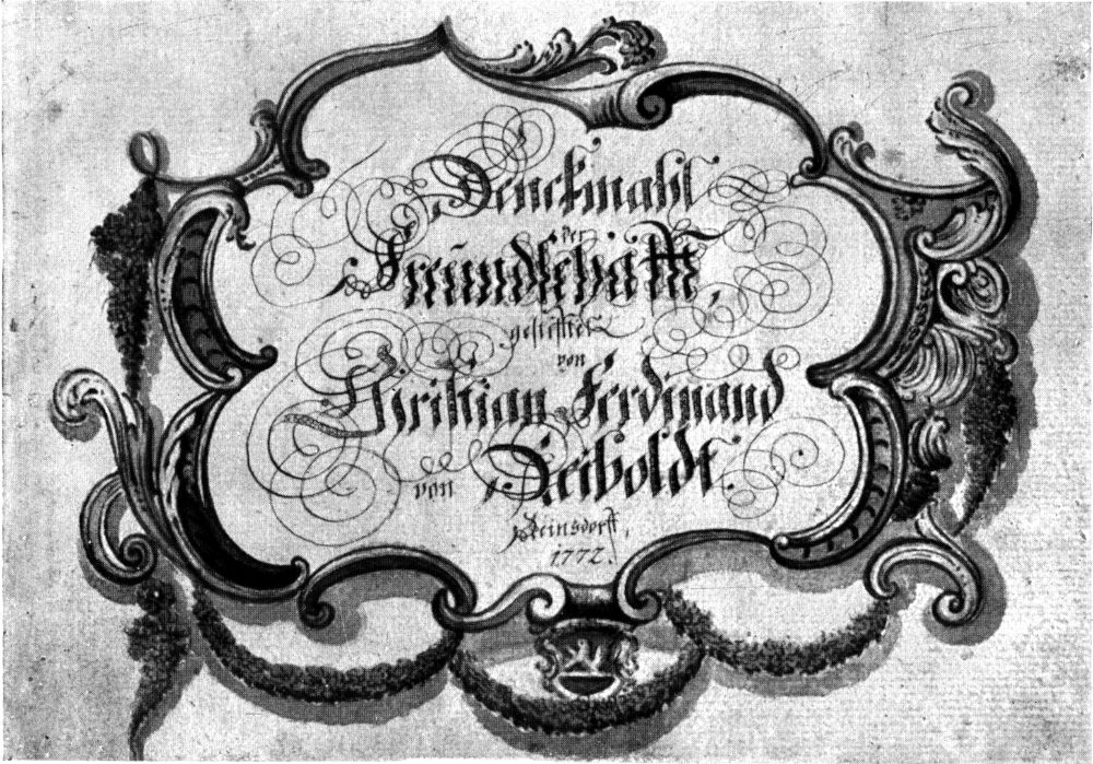 Ferner finden sich Einträge des schon erwähnten Jugendschriftstellers Christian Ferdinand Weiße, der im Hauptberufe Kreissteuereinnehmer war und sich als solcher eingezeichnet hat, sowie des Lustspieldichters Johann Friedrich Jünger, der allerdings damals noch studierte. Gleichfalls Student war zur Zeit seiner Einzeichnung C. F. Ludwig, offenbar Christian Ferdinand Ludwig, der Sohn jenes Hofrats Ludwig, bei dem Goethe zunächst seinen Mittagstisch gehabt hatte. Der Sohn wurde später Professor der Chirurgie und fruchtbarer Schriftsteller in der Heil- wie in der Pflanzenkunde, bei dem sich Goethe für seine Forschungen Rat holte. Zu den damals noch unentdeckten Gestirnen gehört ferner Wilhelm Becker, der sich im Oktober 1776 eingetragen hat. Er wurde 1795 Inspektor der Dresdner Antikengalerie und des Münzkabinets und erhielt 1805 auch die Aufsicht über das Grüne Gewölbe. Goethe erwähnt in einem Briefe an Schiller Beckers Schilderung des Tales von Seifersdorf, die durch Kupferstiche[3] erläutert in dem von Becker herausgegebenen »Taschenbuch zum geselligen Vergnügen« erschienen war. In diesem Zusammenhange muß auch eines Eintrags des Kunstschriftstellers und Generaldirektors der Sächsischen Kunstakademieen Christian Ludwig von Hagedorn gedacht werden. Goethe war ihm vorgestellt worden, als er im Jahre 1768 von Leipzig aus Dresden besuchte, und Hagedorn, erfreut über seine Kunstbegeisterung, hatte ihm persönlich seine Sammlungen gezeigt. Auch Reiboldt, der in so mancher Hinsicht auf Goethes Spuren gewandelt zu sein scheint, hat Hagedorn offenbar bei einem mehrwöchigen Besuche in Dresden kennen gelernt, den er während seiner Studienzeit ausführte.