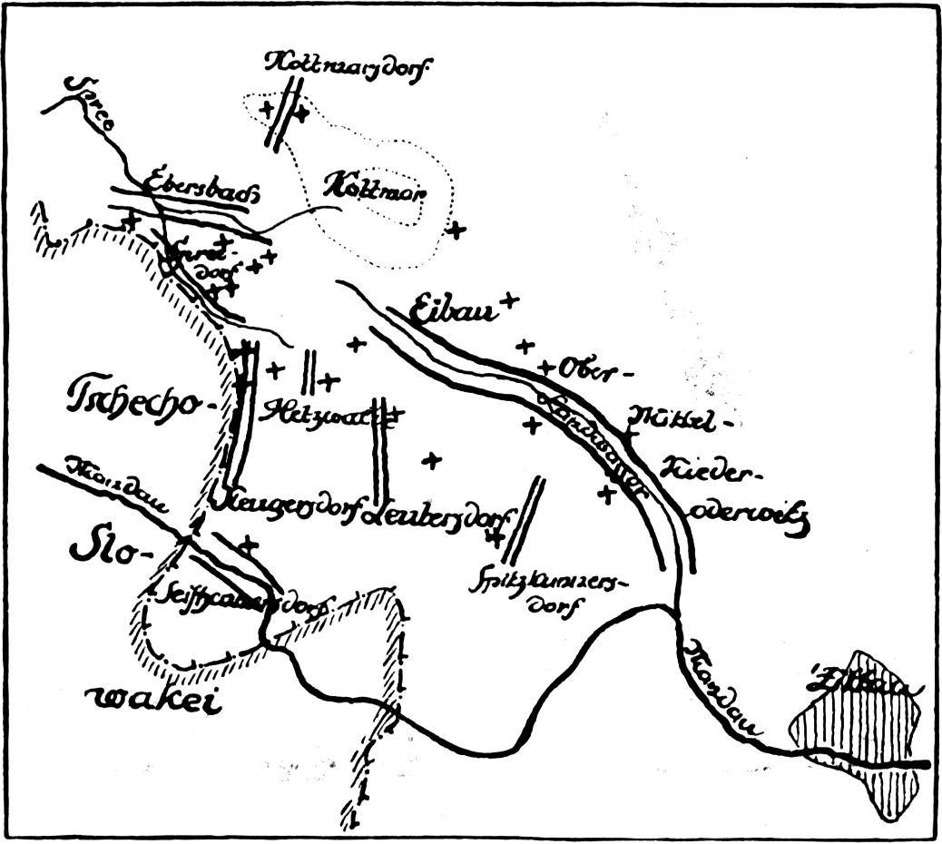 Gegenwärtig kreisen hier nur noch sechs Windmühlen ihre Flügel: Je eine in Hetzwalde, Oberleutersdorf (Eibauer Flur), Kottmarsdorf und drei in Oderwitz. Auf manchen Hügeln steht noch einsam das Wohnhaus, wo einst so viele Dorfbewohner ein- und ausgingen. In Schankstätten wandelten sich andre Windmühlen, und manchen Windmühlengrund furcht wieder der Pflug zur Keimstatt fürs liebe[454] Brot. Die Übersicht berichtet über Standort, Erbauung und gegenwärtigen Befund einer Anzahl Windmühlen, die auf der Skizze angegeben sind, soweit es dem Verfasser nach eingeholten Erkundigungen möglich war.