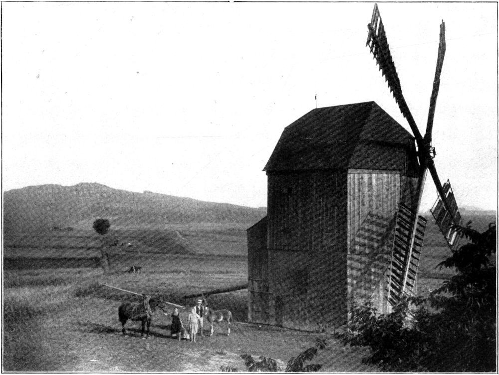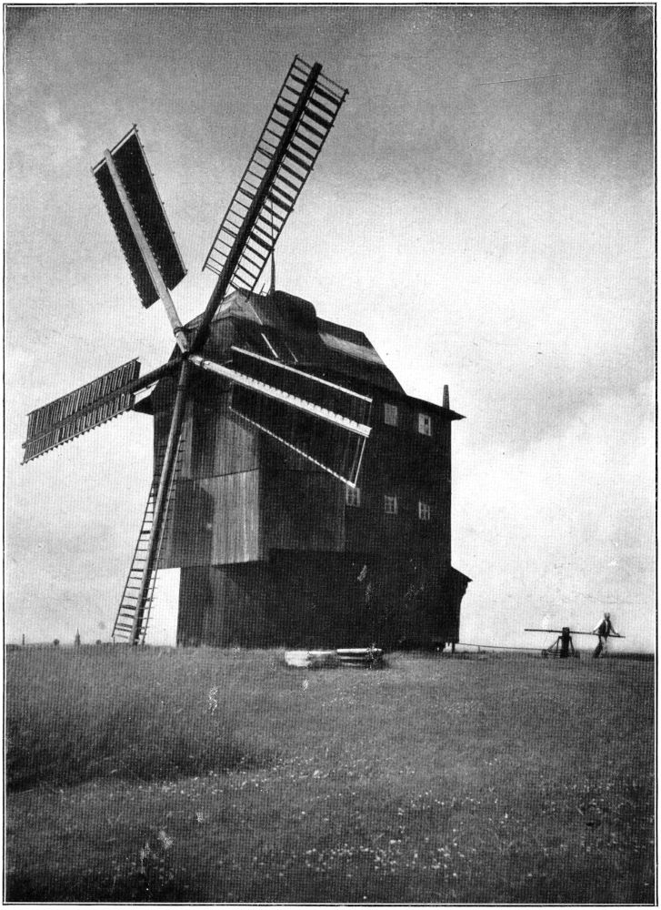 Unser Bild 5 zeigt eine Mühle, die durch die vielen Fenster bemerkenswert ist. Vierzehn große Fenster sind zu sehen, auf der uns abgekehrten rechten Seite weist sie[461] ebenfalls sechs auf, gibt zwanzig Stück. Dazu kommen noch drei kleine, zwei über, eins unter dem vorspringenden Dache. Sie ist die größte von den noch »gehenden« Windmühlen. Auch im Innern weist sie eine Sonderheit im Vergleich zu andern auf, indem außer Spitzgang und Mahlgang noch ein Walzenstuhl aufgestellt ist.[462] Eine beherrschende Stellung nimmt die »Hetzemühle« in dieser Windmühlenlandschaft ein, da sie einmal ziemlich in der Mitte derselben liegt und zum andern auf einem in diesem Gelände besonders hervortretendem Hügel (Abb. 1). Siebzehn Windmühlenstandorte sind von ihm aus zu sehen. Aber nur noch fünf Windmühlen, und davon wieder nur vier kann der »Hetzemüller« gegenwärtig beim Mahlen beobachten.