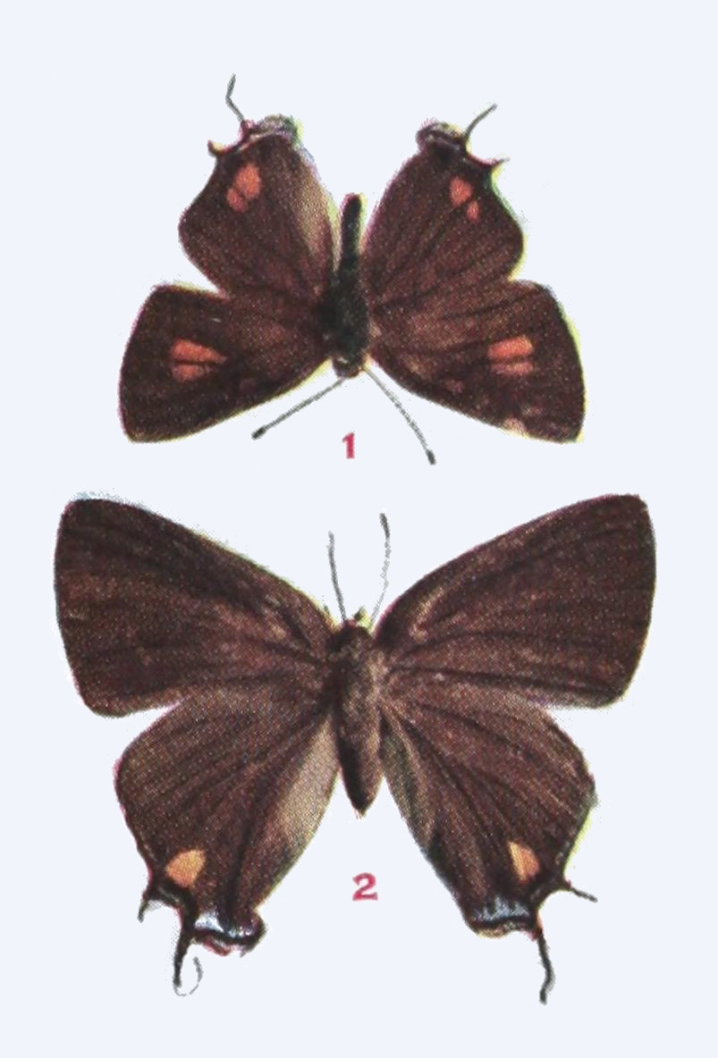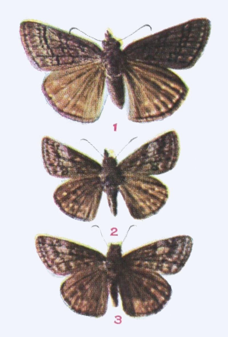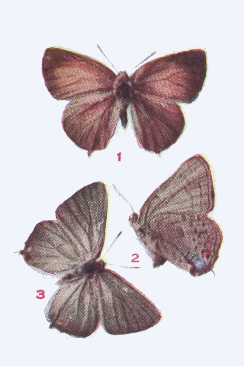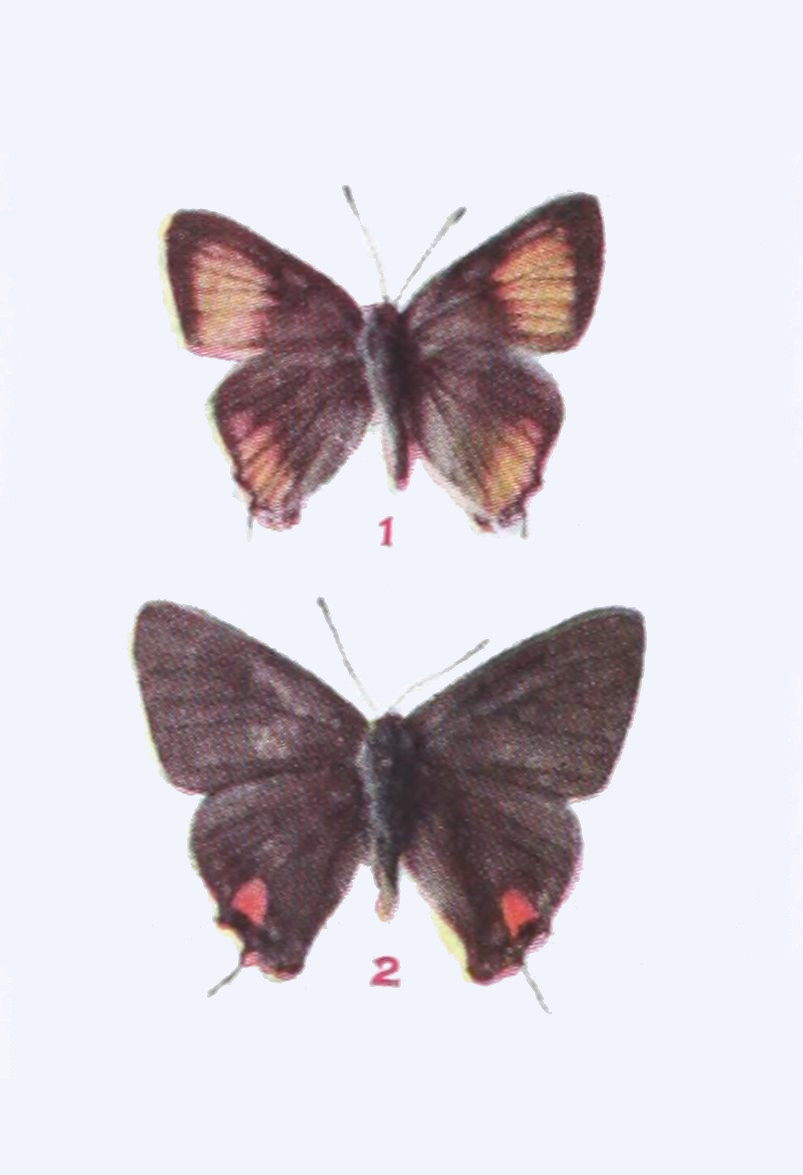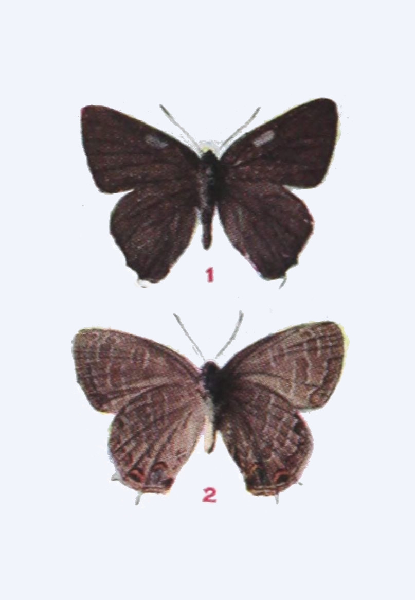The upper side is well represented in our figure. On the under side the wings are a little paler, especially the hind wings, which on their outer half are dusted with gray, in certain lights having a bluish cast. Expanse 1.15-1.25 inch.