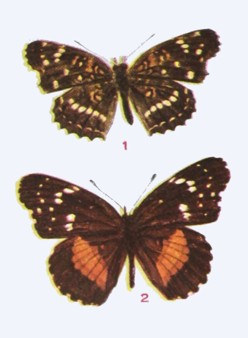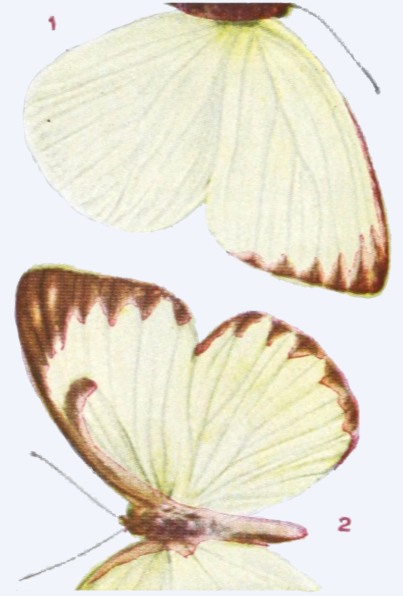 The internal organs of reproduction in the female consist of the ovaries, from which the eggs pass by way of the oviduct to the ovipositor, which in butterflies is not so conspicuous or remarkable an organ as is the case in many other insects. Communicating with the oviduct are the spermatothecæ, which are receptacles in which is retained the fertilizing fluid received from the male at the time of coition. As the eggs, one by one, are passed from the ovaries into the oviduct, they are impregnated through absorption of the spermatozoa, which enter their walls, imparting to them vitality. The internal organs of the male are tubular vesicles, or testes, which secrete the seminal fluid, which by means of the intromittent organ is introduced into the spermatothecæ of the female. Union between the sexes among insects generally takes place but once, and is not recurrent. The female, having been impregnated, proceeds at once to lay her eggs upon the tender leaves or the bark of the plants upon which her progeny are to be nourished, and then promptly dies. The life of insects in the winged form is usually very brief. Inasmuch as there are great differences between the sexes in insects alike in size, form, color, and markings, it is well for the collector to carefully preserve specimens which may be captured in copulation. Such specimens should be designated as “Taken in coitu.” The writer in such cases uses the formula “A ♂ in coitu with B ♀,” which is put in minute handwriting upon a label and placed upon the pin bearing the male insect. Upon the pin carrying the female insect there is put the label “B ♀ in coitu with A ♂.” The finding of insects in copula is sometimes the only way in which to definitely settle the question of sexual relationship between forms. So different are some insects that the two sexes have in a number of cases been described by early writers as belonging not merely to different species, but to different genera, and even families.