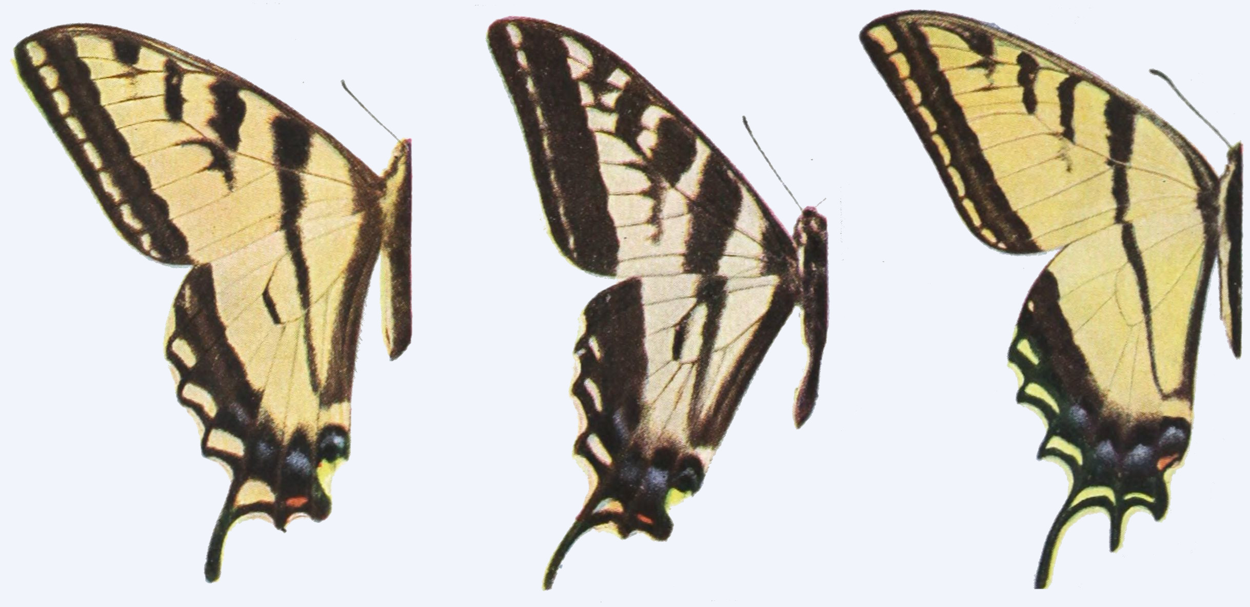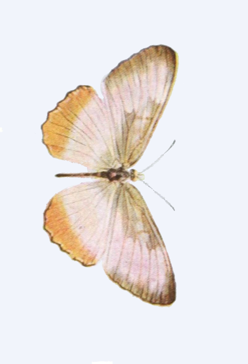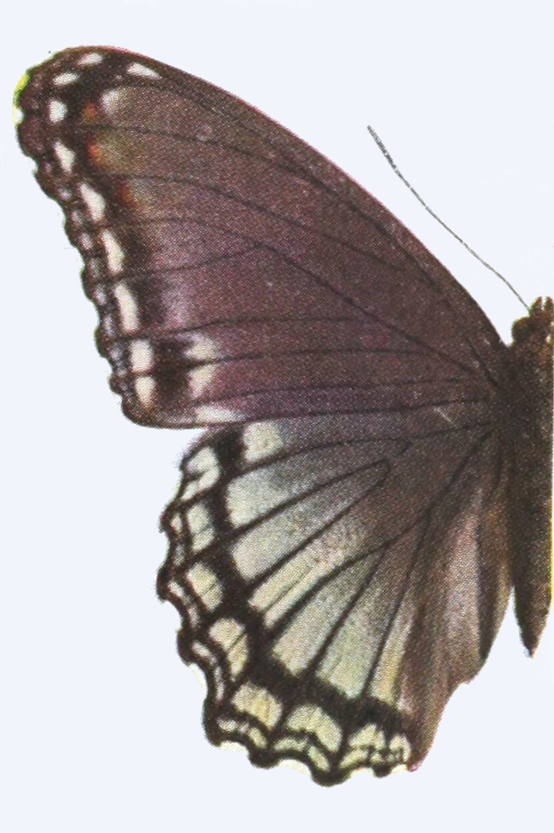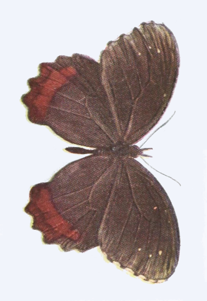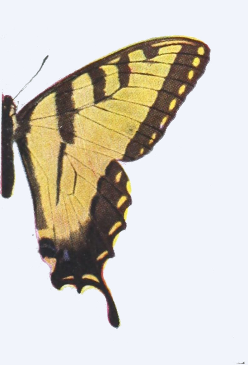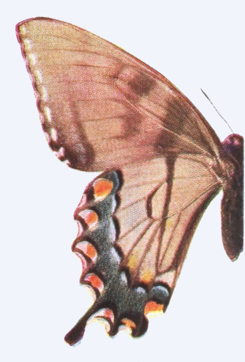 The wings consist of a framework of horny tubes which are in reality double, the inner tube being filled with air, the outer tube with blood. The blood of insects is not, like that of vertebrates, red in color. It is almost colorless, or at most slightly stained with yellow. The circulation of the blood in the outer wall of the wing-tubes takes place most freely during the brief period in which the insect is expanding its wings after emergence from the chrysalis, concerning which we shall have more to say elsewhere. After the wings of the butterfly have become fully expanded, the circulation of the blood in the wings ceases almost entirely. The horny tubes, which compose the framework of the wings of butterflies, support between them a delicate membrane, to which upon both the upper and lower sides are attached the scales. The two fore wings are more or less triangular in outline; the hind wings are also subtriangular, but are generally more or less rounded on the outer margin, and in numerous forms are provided with tails or tail-like prolongations.