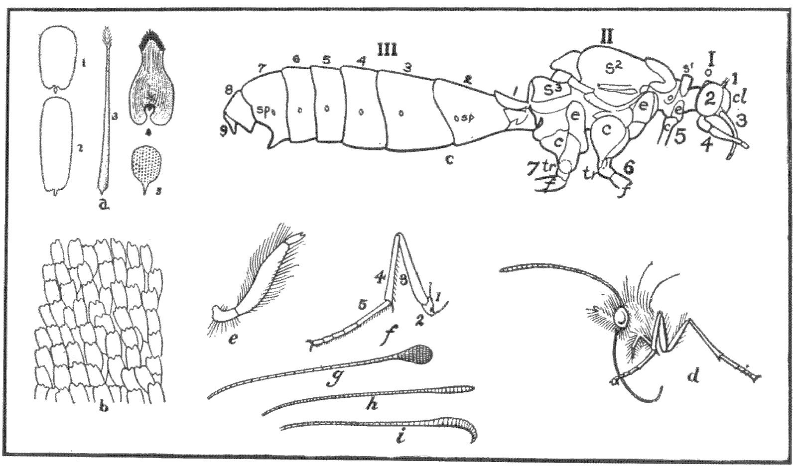 | II. | Thorax. 5, prothoracic leg; 6, mesothoracic leg; 7, metathoracic leg; e, e, e, episterna; c, c, c, coxæ; tr., tr., trochanters of last two legs; f, f, femora of do.; s, s, s, scuta of first, second, and third segments of thorax. | |