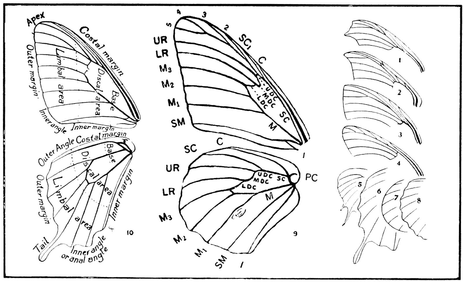 Inasmuch as in describing butterflies authors generally devote a good deal of attention to the markings of the wings, it is important for the student to become acquainted with the terms employed in designating the different parts of the wings[18] (see Plate B, Fig. 10). That part of the wing which is nearest to the thorax, is called the base; the middle third of the wing is known as the median or discal area; the outer third as the external or limbal area. The anterior margin of the wing is called the costal margin; the outer edge is styled the external margin; the inner edge is known as the inner margin. The tip of the front wing is called the apex, which may be rounded, acute, falcate (sickle-shaped), or square (see Plate B, Figs. 1-4). The angle formed by the outer margin of the front wing with the inner margin is commonly known as the outer angle. The corresponding angle on the hind wing is known as the anal angle, and the point of the hind wing, which corresponds with the tip or apex of the fore wing, is designated as the external angle. The margins of wings may have different styles of outline, and are spoken of as entire, crenulate, scalloped, waved, lobed, or tailed (see Plate B, Figs. 5-8).