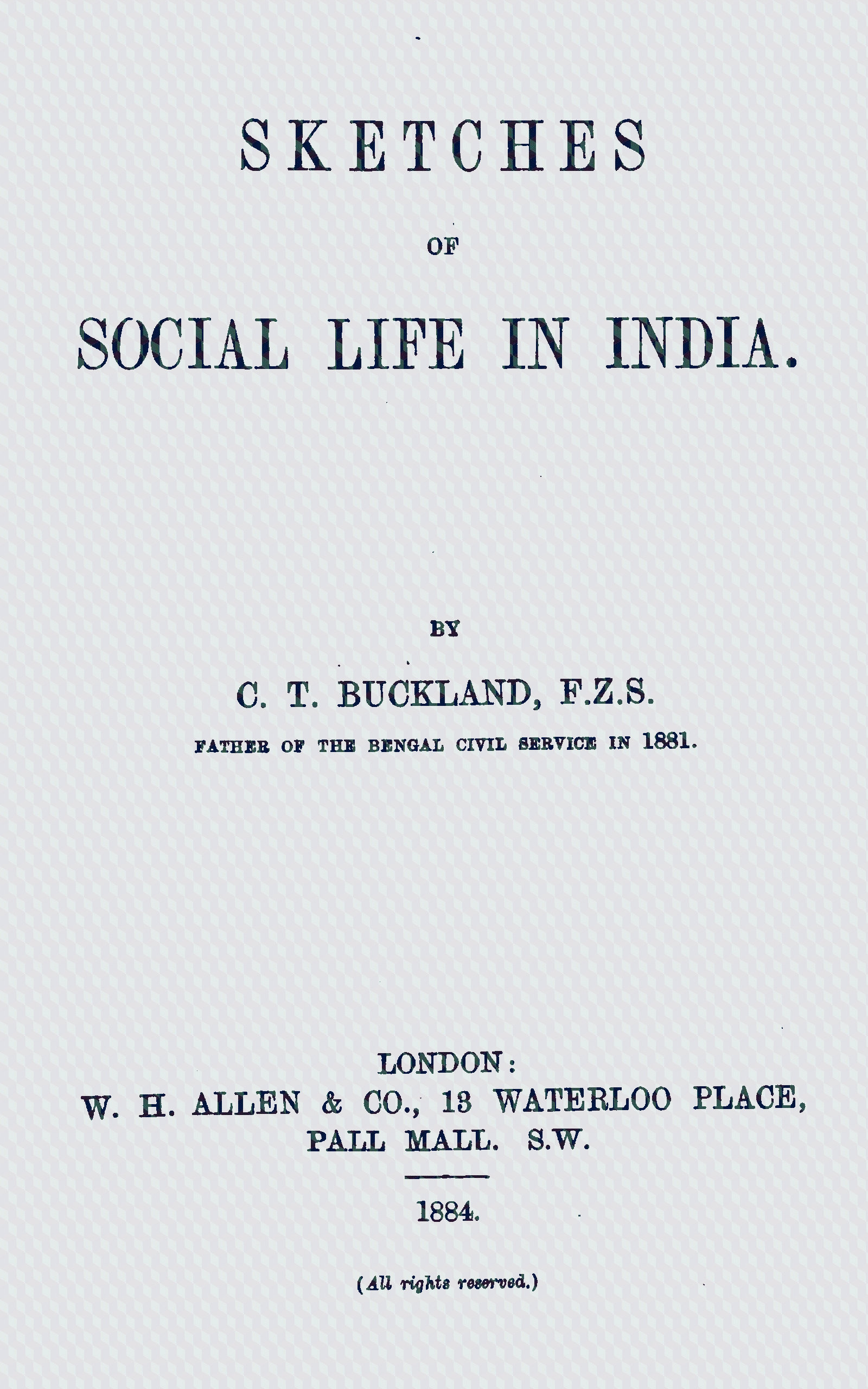 The first two chapters of this book were published more than a year ago in the Army and Navy Magazine, and are reprinted with the kind permission of the proprietors, Messrs. W. H. Allen & Co. The other chapters were written about the same time, as articles for the same Magazine, but not being sufficiently within the scope of a military and naval periodical, it was resolved to produce them in the present form. The author, in the course of a long career in the Bengal Civil Service, has held nearly all the appointments which he has attempted to describe in connection with that service, and he had many opportunities of becoming acquainted with all the mechanism of Indian government, as seen from Calcutta and the Lower Provinces of Bengal. In his attempt to give a sketch of social life in India, it must be remembered that he is writing chiefly of the Lower Provinces of Bengal. He has endeavoured to avoid anything which might give personal offence, and he would gladly adopt as his vimotto, “Ridentem dicere verum quid vetat?” It is hoped that this book may afford some entertainment to those who have been in India, and that it may be of use and interest to those young men who are thinking of devoting themselves to a professional career in India. It only remains to observe that these papers were written before the recent agitation in connection with the Ilbert Bill, but it has not been found necessary to alter anything that had been written as regards either the English residents or the native community.