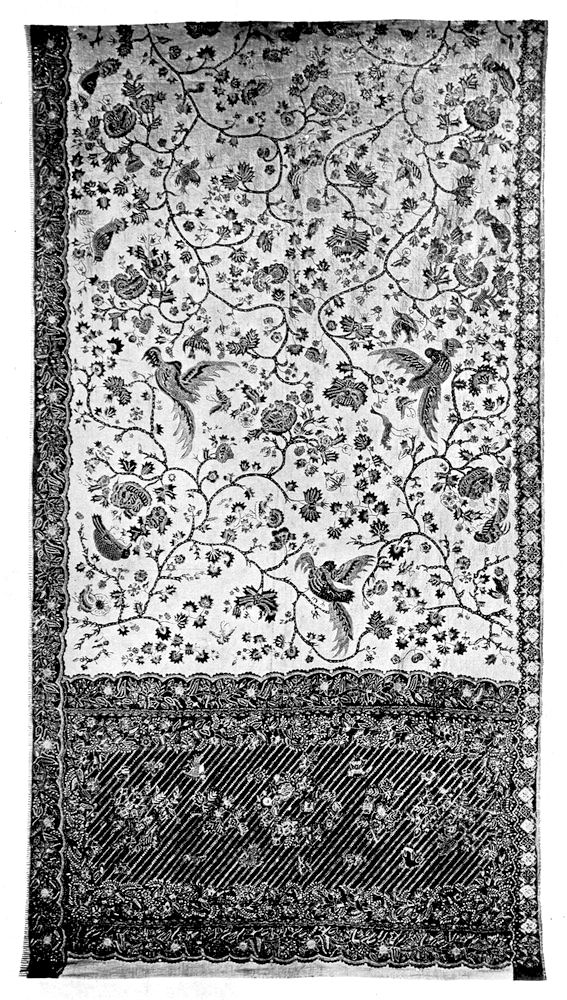 The “slendang” is no more complicated as to shape and the decoration is either in the form of an all-over design, or it has a plain centre with a decorative border. It is usually about three yards long and eighteen inches wide, and it is worn by the women who throw it over their heads, scarf-wise, but its use is more general as a “carry-all” for babies and other personal effects.