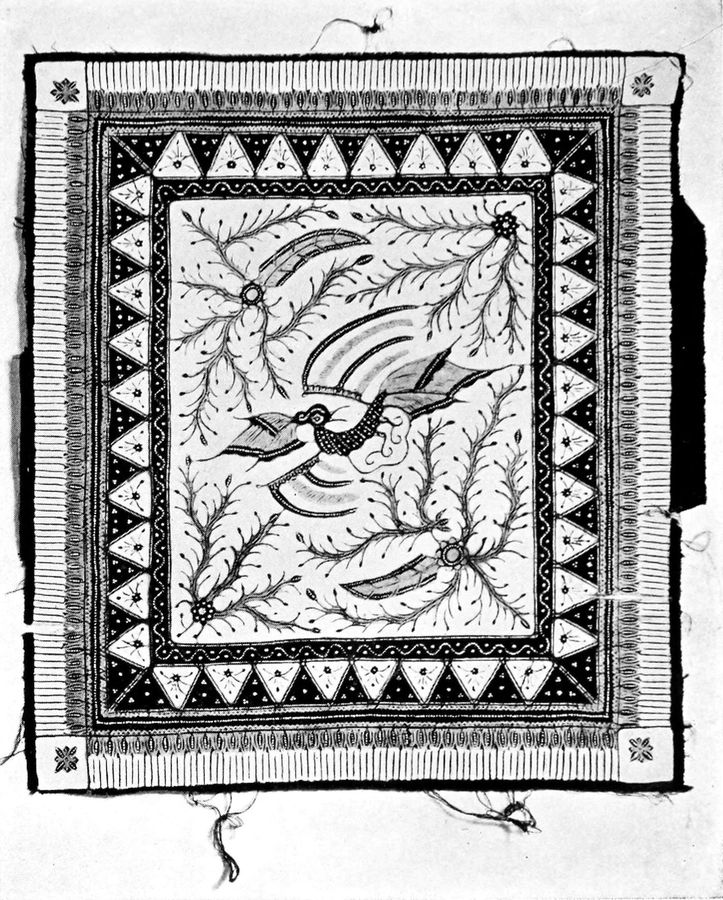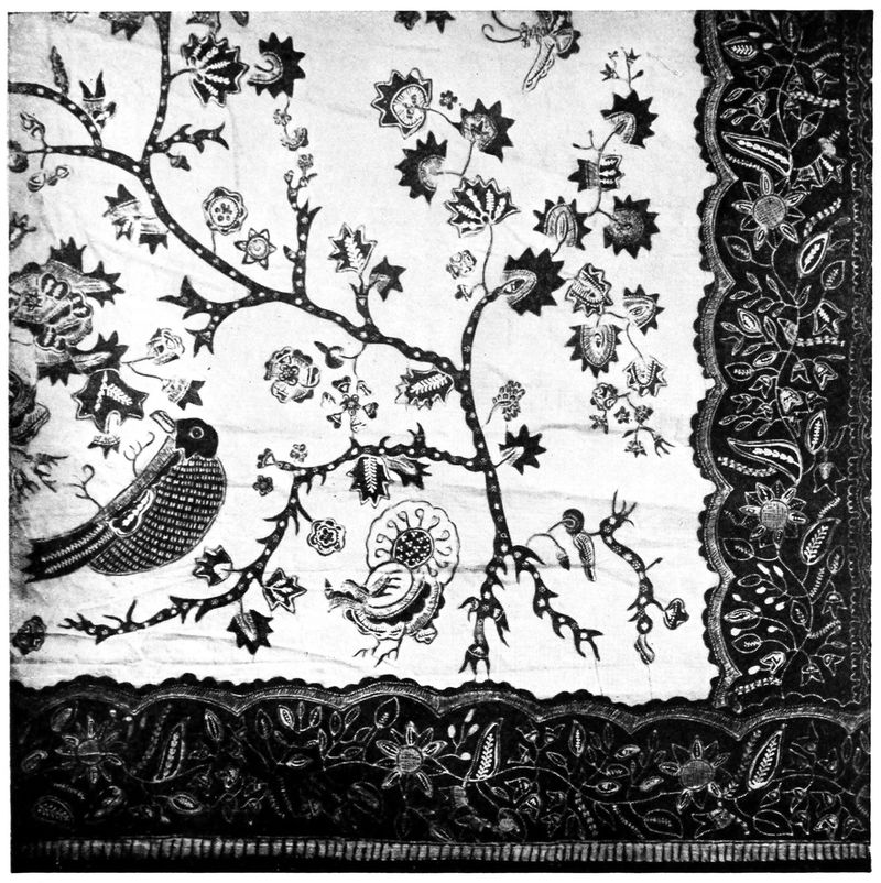 For two hundred and seventy odd years it has been known in Holland, to which country it was brought by the Dutch traders from Java in the middle of the seventeenth century. It was not, however, received very enthusiastically and the commercial failure that followed the importation of some 2000 pieces (which were finally sold at auction, as no market could be found for them through regular channels) did not encourage traders in their efforts to popularize batiks. From that time, that is, about 1750 until 1817, interest in the work decidedly flagged and the honour of reviving it[25] must be given primarily to Raffles who gave a description of it in his well known “History of Java” published at the latter date. He, however, seems to have had very little personal feeling for the art and merely wrote it up as a matter of history, and it remained for the modern artists to give it is first real impetus.