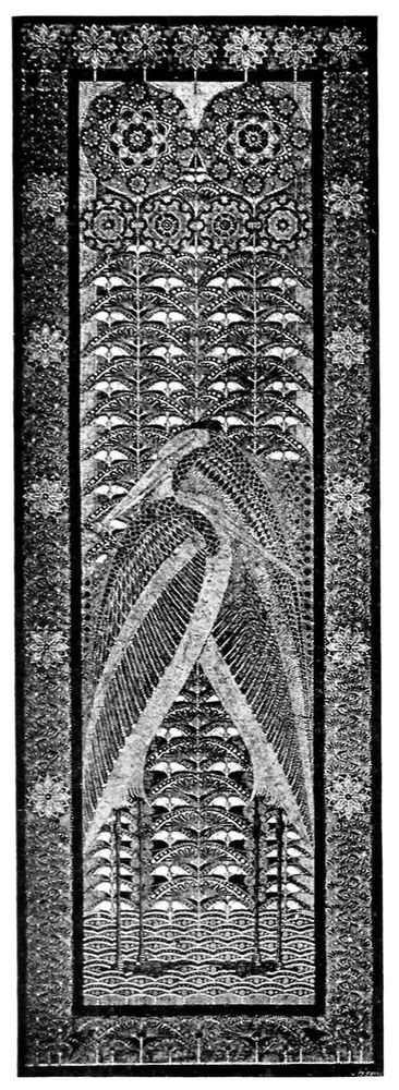 In the second reproduction it can be seen that the little dots are actually laid in circles, but with such regularity that no circles are shown. The workmanship in the stork design is even more amazing than that of the two first decorations and it is hard to believe that a human being has had sufficient patience to execute such a design.