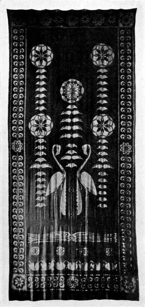 Other designs have significance in that they designate rank or social prestige. Some hundred[6] of these patterns have regular names, such as “batik parang rusa” and “batik sawat”; these two are reserved for the exclusive use of royalty, and many designs are esteemed as much for their social ranking as for their artistic merit. Decorated silk is occasionally worn by the native aristocracy; it is not in general use, however, and is always made in the form of a “slendang” and worn as a scarf. The colours found in a batik can be interpreted to denote the part of Java in which it was made. Those from Djocdja and Solo are executed in rich tans, beautiful golden browns and deep indigo blue, which colours are used on the royal batiks; the work from these districts is sombre in tone but very rich in design. Pekalongan batiks are usually in white and different shades of blue, or rather cream and blue, for the native treats his fabric with oil before starting to work and this gives a rich creamy tone to the white. Dead white itself is never used as it is literally associated with the dead, being the colour of grave cloths and always signifying death. Variety of colouring in a batik will[7] mean as a rule that the piece had its origin in the district of Samarang.