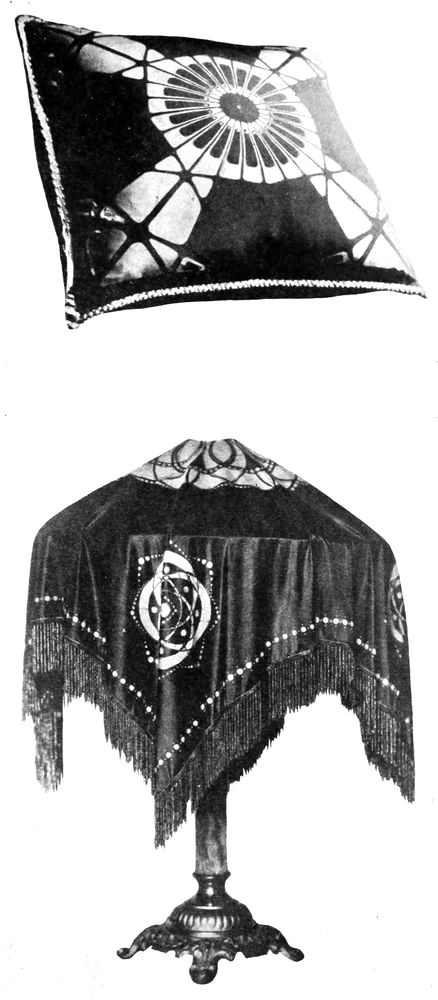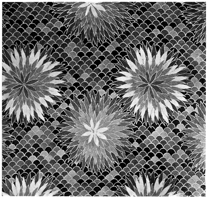 The all-over floral design shown facing page 36, designed by the writer and executed by Miss E. Shirtleff, was made in six colours. This panel was done in the “blue group,” explained in the chapter on dyeing. The outline of the flowers is in the original white of the material, the petals of the flowers range in colour from straw yellow to orange, with some of the outer ones in moss green. The background has a “wave design” worked out in all the different colours used in the flowers and an extra shade of dark green. The waxing of this piece was done entirely with the brush and has no line of a greater width than one-sixteenth of an inch.