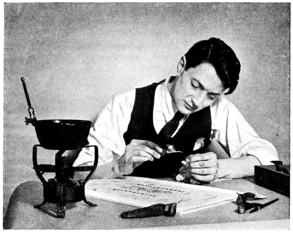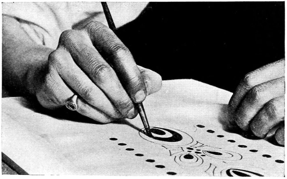 The black was started pure, at a temperature of about 90°, and the piece remained in this bath about an hour; it was then taken out, the temperature brought up to 110°, blue added to the solution and the panel again dipped for another hour. The blue was added in order to improve the tone of the black. A solid blue-black was obtained in this way in place of the rusty black that would have been the result of dyeing straight black over the red. After the required intensity of tone had been reached, the piece was well rinsed and dried, preparatory to dipping in gasoline to remove the wax.