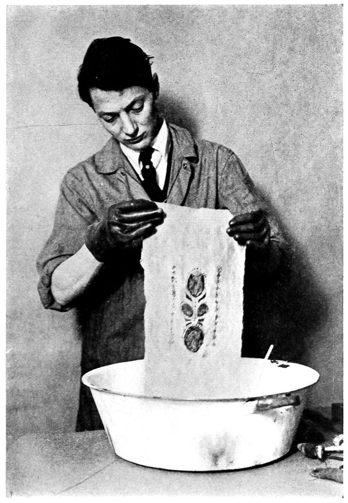 The panel was now dipped in an ammonia bath to extract the colour from the parts not covered by wax. This took from 15 to 20 minutes with a temperature of 100° Fahr. When the colour in the fabric was reduced to a light grey, the piece was transferred from the ammonia bath to a tub of clear water at the same temperature, and rinsed thoroughly for at least an hour, in order to remove every trace of the ammonia. After drying, the whole panel was carefully gone over to close all undesired cracks[82] that had come during the colour extracting process; these were mainly in the figure and the scarf.