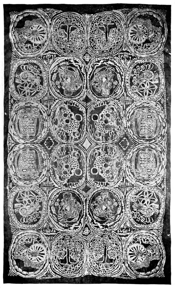 When the tjaps are finished and found correct, that is, when every little line on one die[11] is found to correspond exactly with the same line on the reverse block, then it is the business of the printer to print the tjaps so that no difference is shown in the design. The making of a pair of tjaps is only necessary when an irregular design is to be produced, as in the case of a symmetrical pattern the same die can be used on both sides.