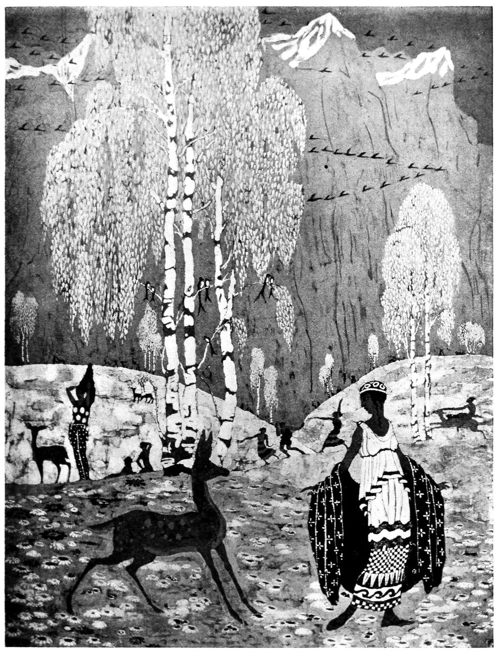 “Spring,” the panel illustrated facing page[66] 64, designed by Bertram Hartman and executed by him and the writer, is one of the early batiks designed by this artist. It was dyed in the group of the blues and no reds were used in the making of it. It was dipped eight times, the original white of the material making the ninth colour. The waxing of this piece was done entirely with the brush, no tjanting being used, and gives a fair idea of the fine work that can be done with the brush, if one considers that the size of the original panel is only about forty by sixty inches.