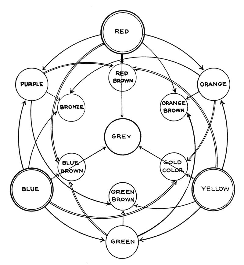 [69] A careful study of the accompanying colour mixing chart will give the reader an idea of the way various shades are produced from the primary colours.