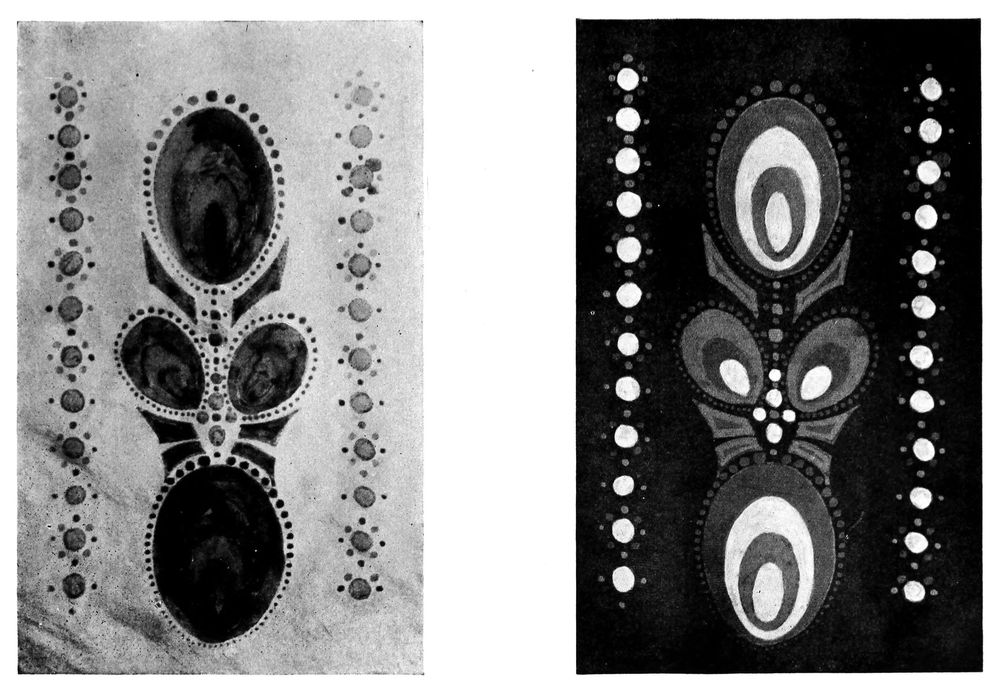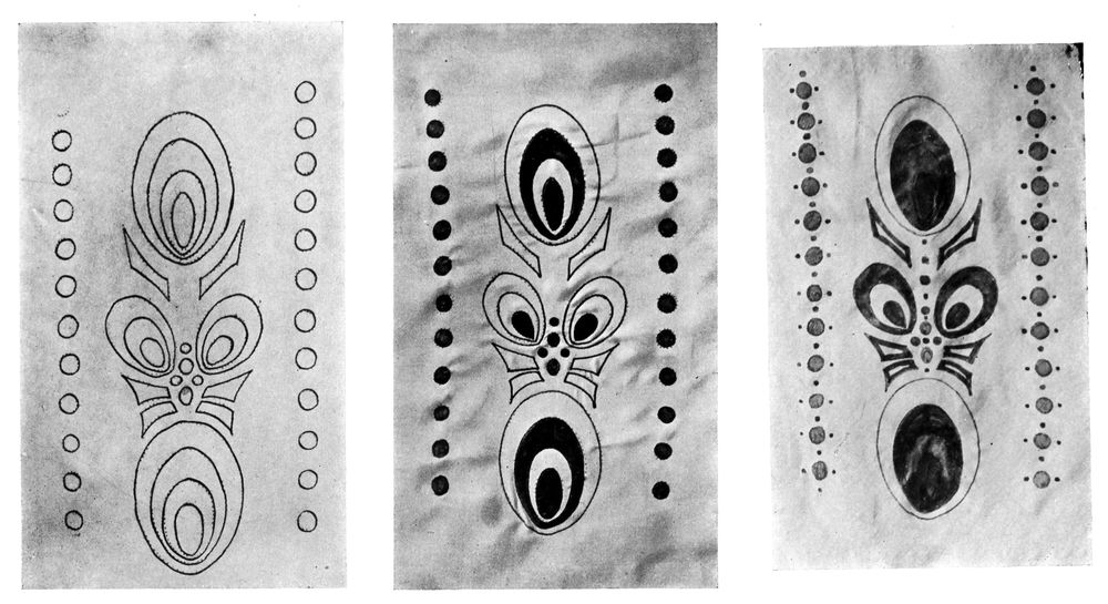 Some people, when they wish to have opposing colours, such as blue and red, in the same design, resort to the native method of removing the wax entirely after each dipping and re-covering the parts already dyed. This takes a great deal longer and the wax needs very careful dissolving, as the fresh dye will not “take” unless every particle of it is removed from the[68] fabric and even then it is not easy to get a successful dipping as the gasoline used for the dissolving is more or less greasy and of course grease has no affinity with water. White lines, or lines the colour of the original fabric, are apt to show too, if one has overstepped the boundary when covering up the first colour, prior to the second waxing.