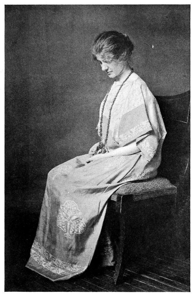 The record shows the process of dyeing in the making of the “Sorceress” panel, shown facing page 78. The silk used for this panel was a very heavy Japanese crepe and the design was worked out in nine colours. That is to say, it was dipped eight times, the ninth being the original white of the silk. The only places where this original white shows is in a few little flowers in the branches of the trees, and these, on account of the many times the piece was dyed, have so much crackle in them that they do not appear as pure white.
