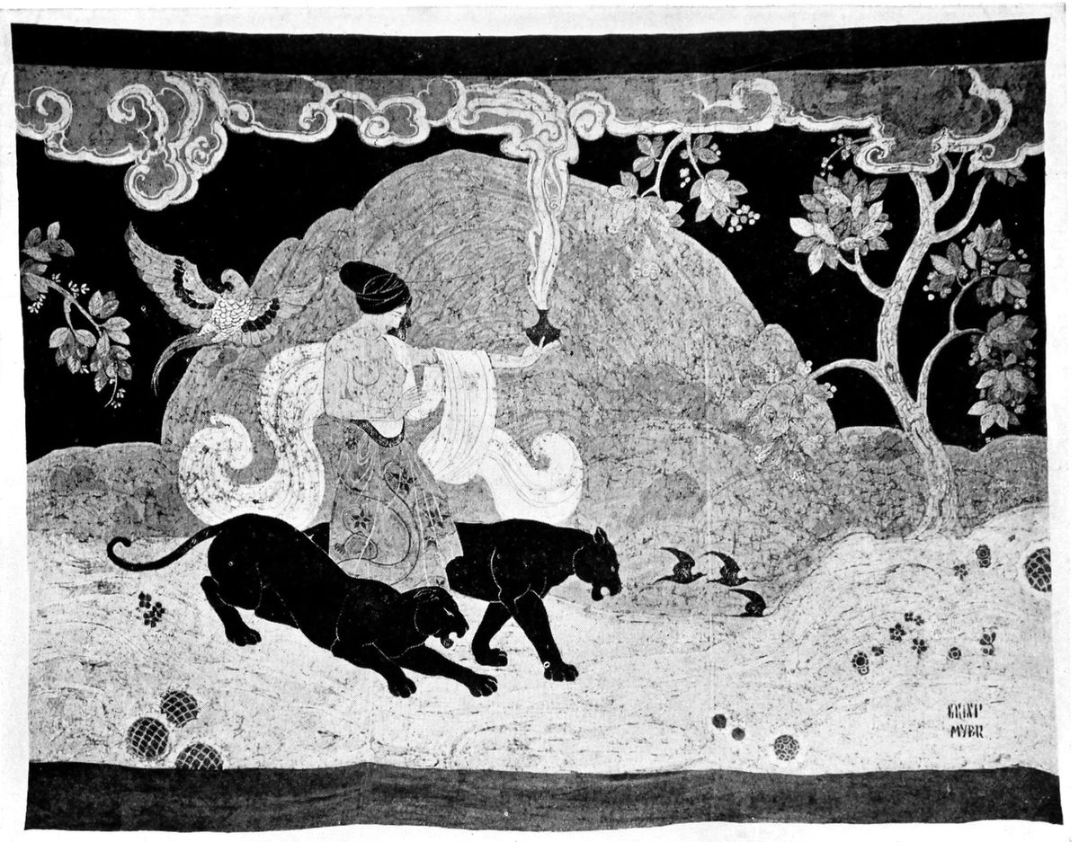 Dijesselhof considers batik a better way to express himself for his mural decorations than either oil or water colour painting. He uses the brush to a great extent and works with great freedom of execution, making the medium conform to his own particular type of work. Lebeau, on the other hand, after the manner of the Javanese, sees the tjanting as the only tool with which to produce his richly fantastic designs. Lebeau is technically the greater artist and possesses a supreme disregard of time when he is producing a magnificently ornamented textile;[28] his attitude toward his work is reminiscent of that of the monks who in bygone ages, spent years on the intricate and beautiful ornamentation of their laboriously hand-lettered books of devotion. They, too, had perfection of design and craftsmanship as their only standard.