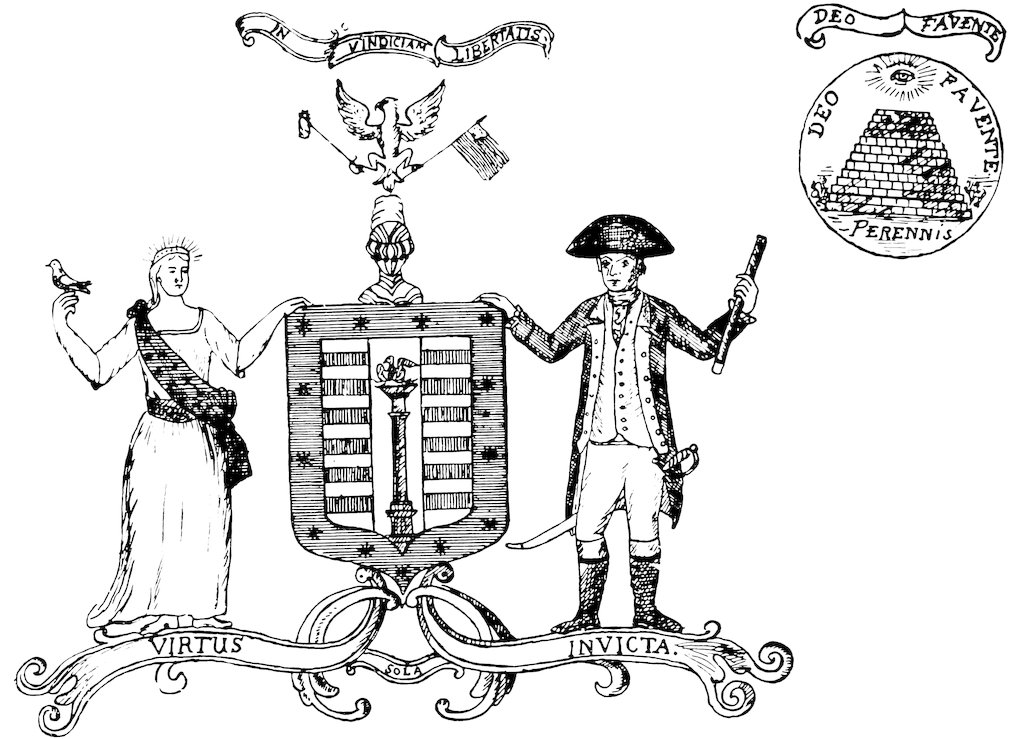 Supporters, dexter the Goddess Liberty in a corselet of armour alluding to the present Times, holding in her right Hand the Spear and Cap and with her left supporting the Shield of the States; sinister, the Goddess Justice bearing a Sword in her right hand, and in her left a Balance.