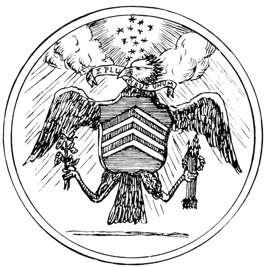 The committee to design the arms of the new nation had no national precedent to follow, for the arms of a kingdom are nearly always those of the sovereign or his family, and the new Republic could accept no individual’s arms. The several colonies, however, each had a seal, and these, as they were generally significant and simple, would have been a fair guide to the exigencies of a national seal. The members of the committee, however, had an idea that an allegorical picture significant of the fortunes and destiny of the United States would be more appropriate; but as none of them could draw they called into consultation Eugène Pierre Du Simitière, a West Indian Frenchman who lived in Philadelphia and had a reputation as an artist and author. John Adams, 9in a letter to his wife, August 14, 1776, told the story of the committee’s efforts to make the seal: