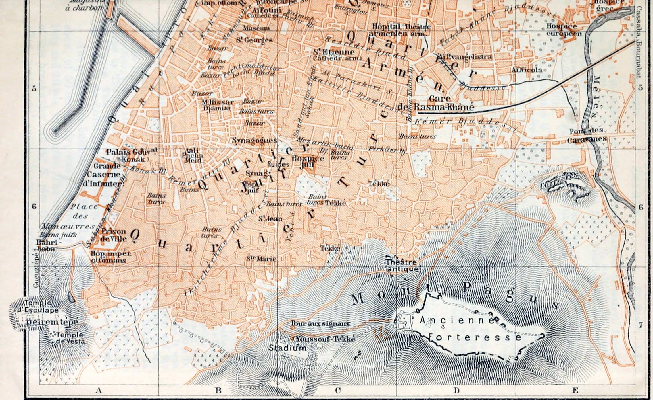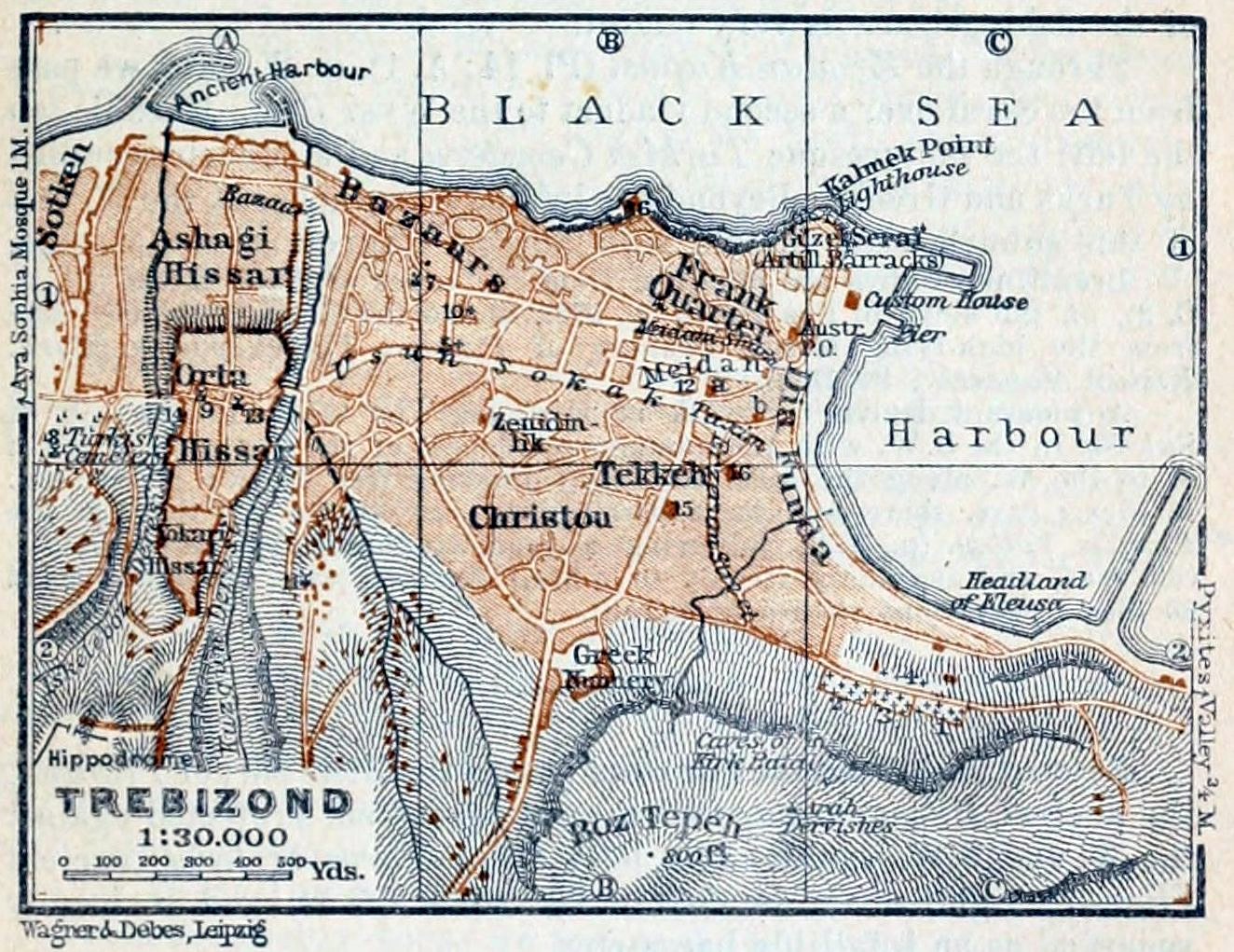 The trade and industry of Trebizond are concentrated in the new town on the East Hill, above the harbour. Beyond Kalmek 573Point, on which are a battery, a lighthouse, and the Güzel Seraï (Pl. B, C, 1; now artillery-barracks), lies the Greek quarter, which encloses the Frank quarter, the seat of the European wholesale merchants. On a small promontory projecting from the N. shore rises the Greek Cathedral (Pl. 6; B, 1).