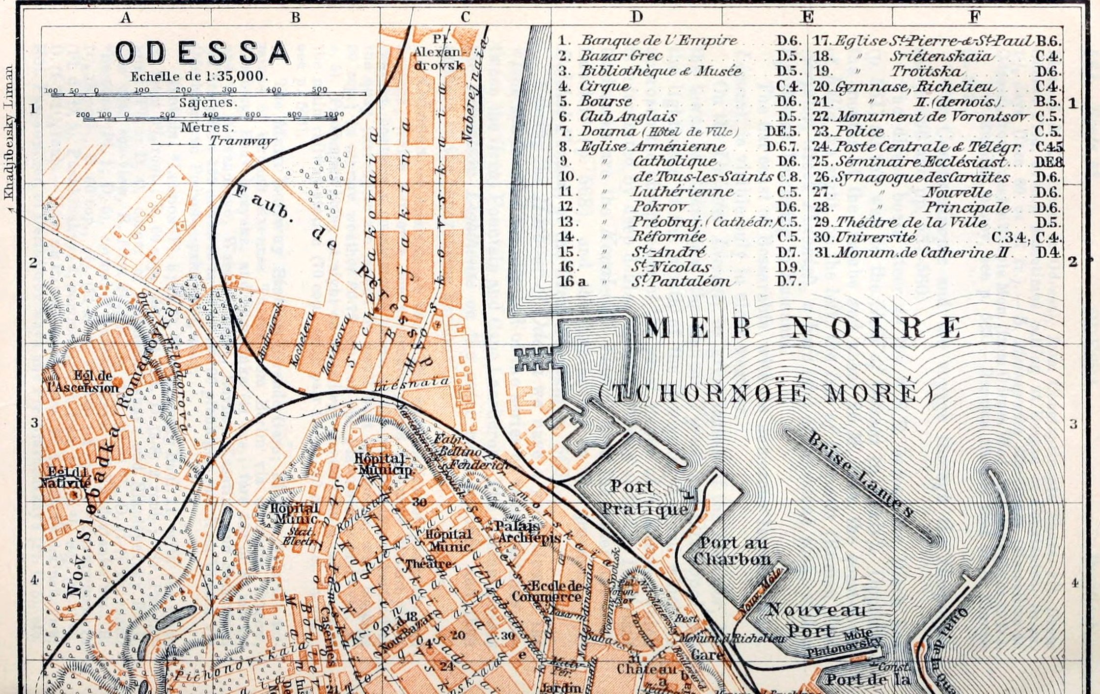 Hotels. *London (Pl. b; D, 5), Nikoláyevsky Boul. 11, with sea-view, R. from 2½ roub., B. 60 cop., déj. (11–3) 1, D. (3–8) 2 roub.; *St. Petersburg (Pl. c; D, 4), corner of Yekateríninskaya and Nikoláyevsky Boul., also with sea-view, R. from 2½, B. ½, déj. (11–1) ¾, D. (1–7) 1¼ roub.; *Bristol (Pl. i; D, 5), corner of Púshkinskaya and Kondratenko Sts., R. 1½–15 roub., B. 60 cop., déj. (11–2) ¾, D. (1–8) 1–2 roub.; *Yevropéiskaya (Pl. d; D, 5), Púshkinskaya 4, commercial, R. from 1½, B. ½, déj. (11–1) ¾, D. (1–7) 1¼ roub.—Hôt. de Paris (Paríshskaya; Pl. f, D 5), Púshkinskaya 8; Hôt. Passage, cor. of Deribássovskaya and Preobrashénskaya (Pl. C, 5), etc.